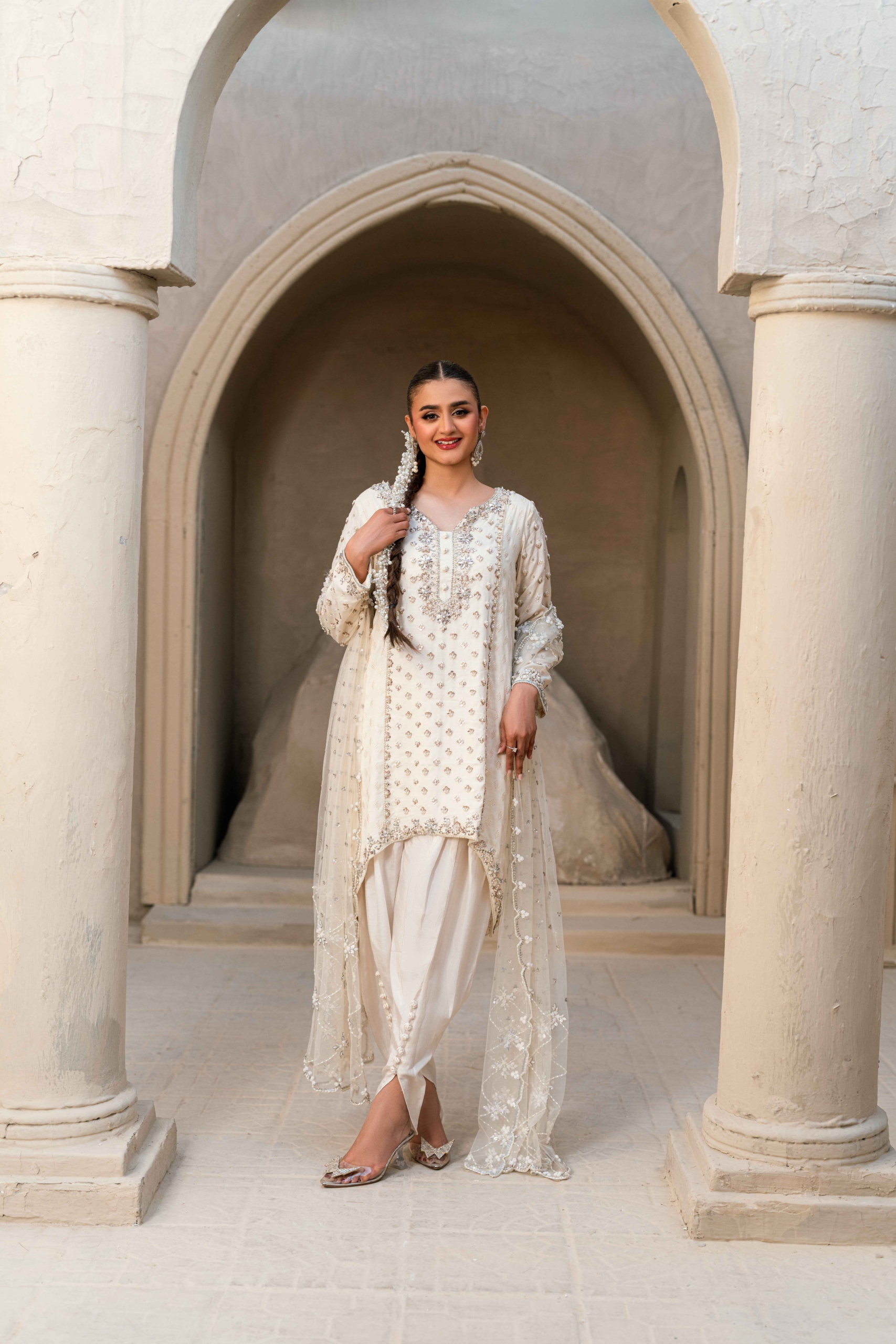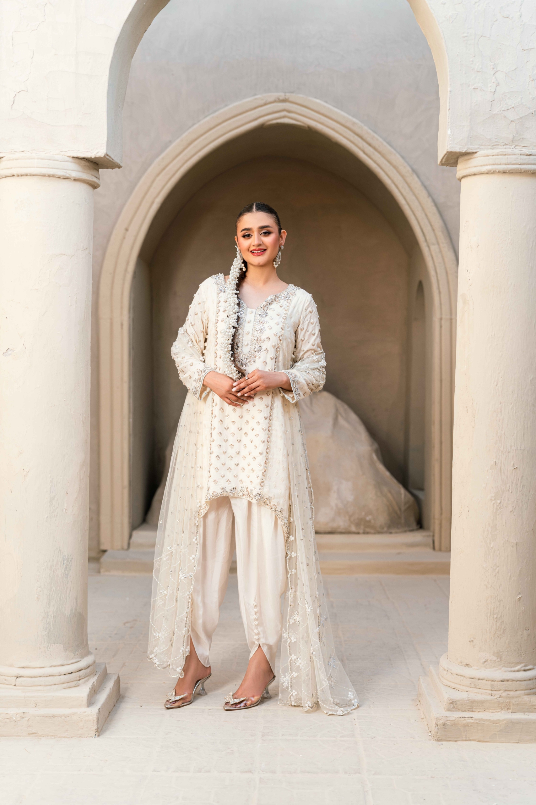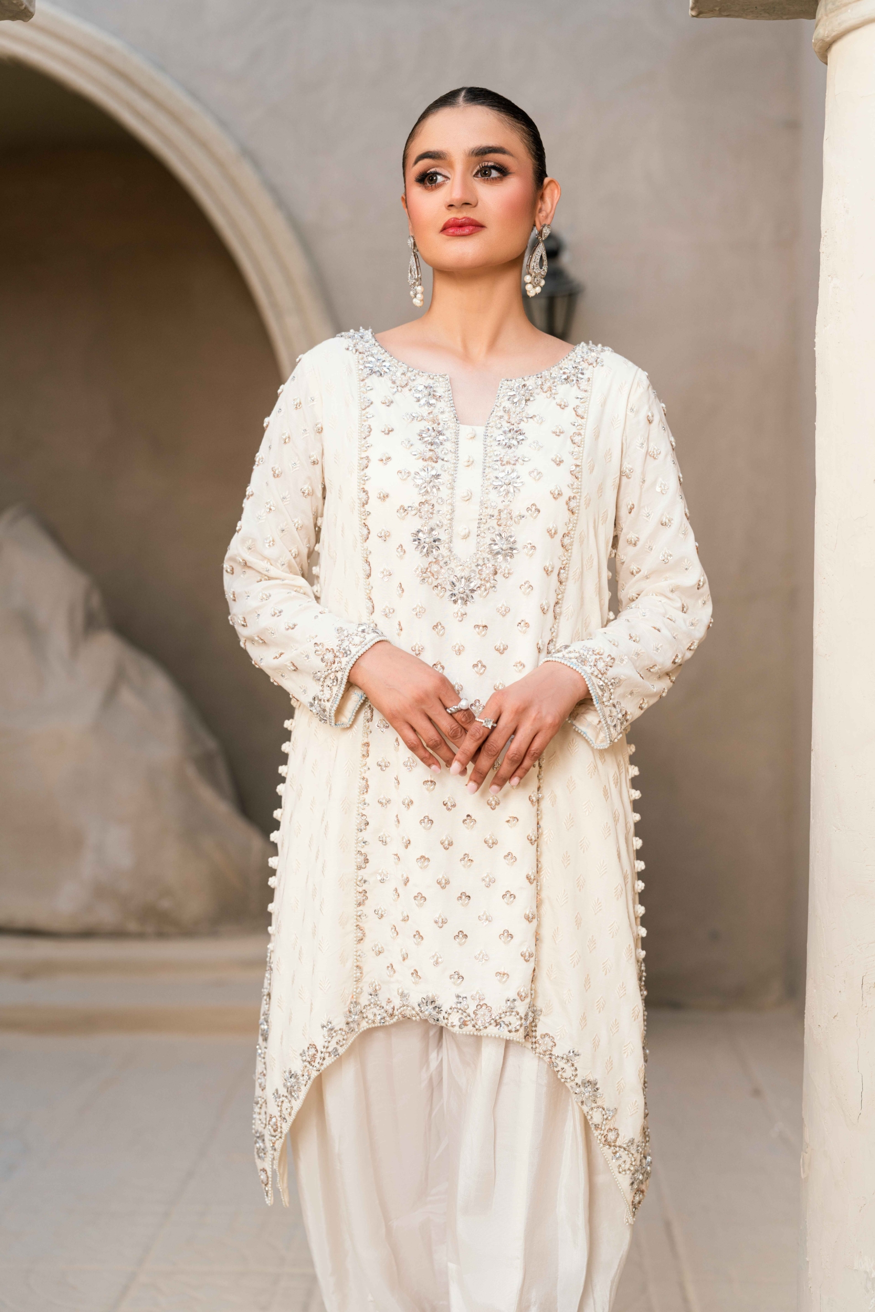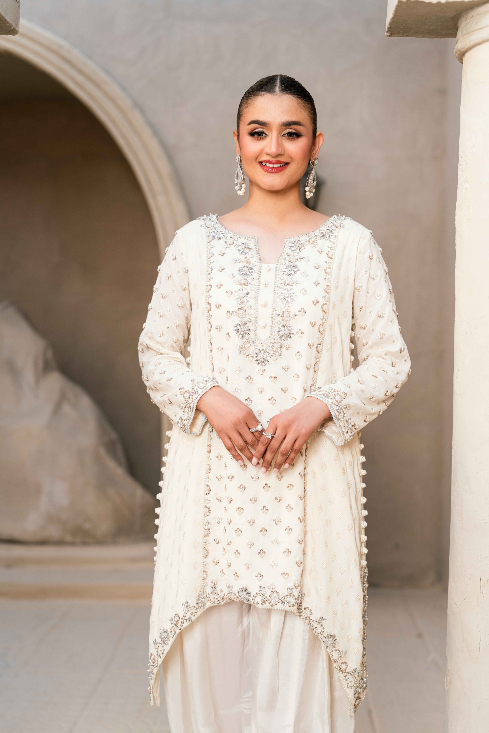 Details “Ethereal elegance! Hira Mani exudes refinement in our exquisite off-white A-line frock, expertly paired with a tulip shalwar and intricately embellished jaali-style dupatta. Delicate handmade flower buttons, luminous pearls, and precision-crafted embellishments adorn this Eid masterpiece, rendering it truly unforgettable.