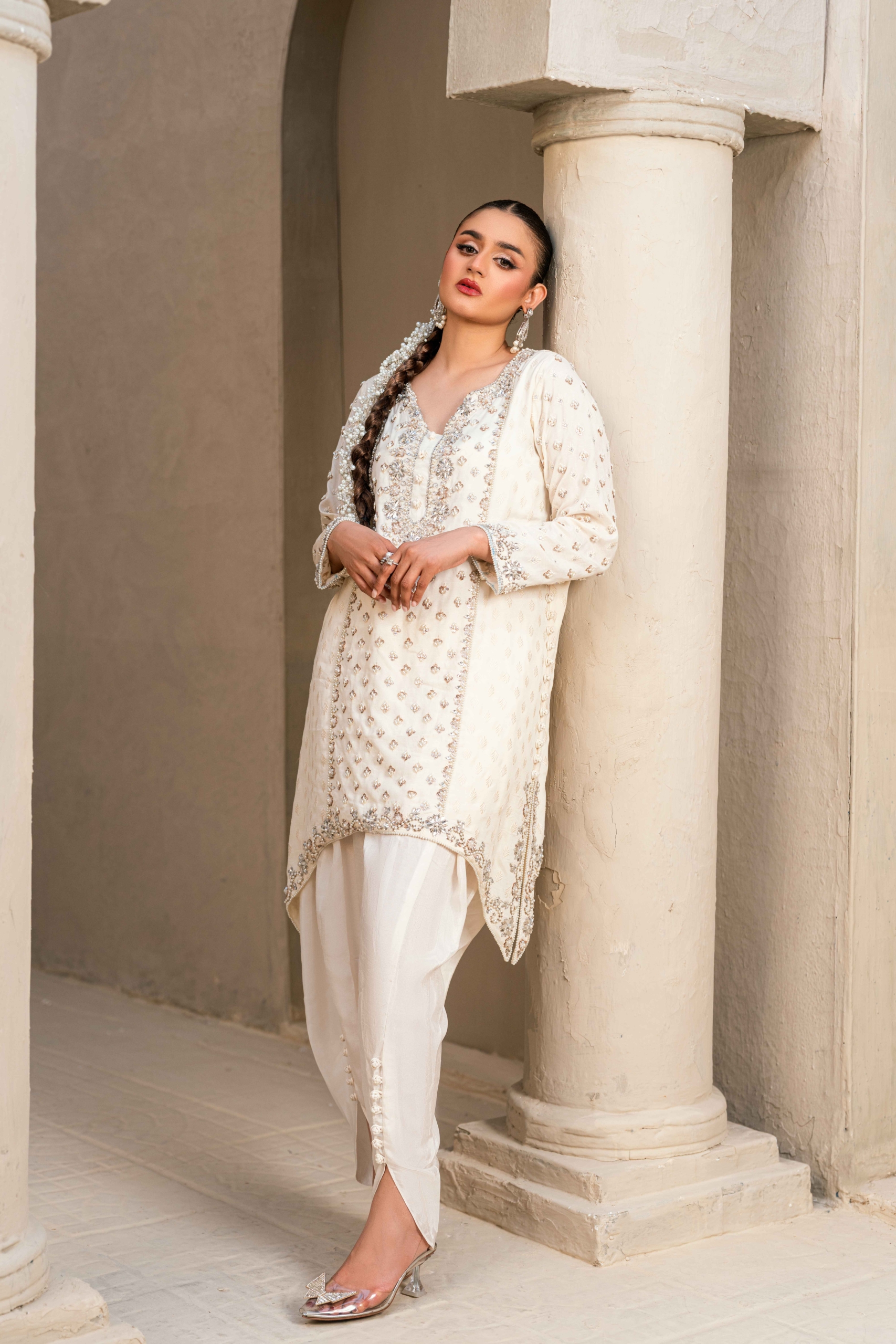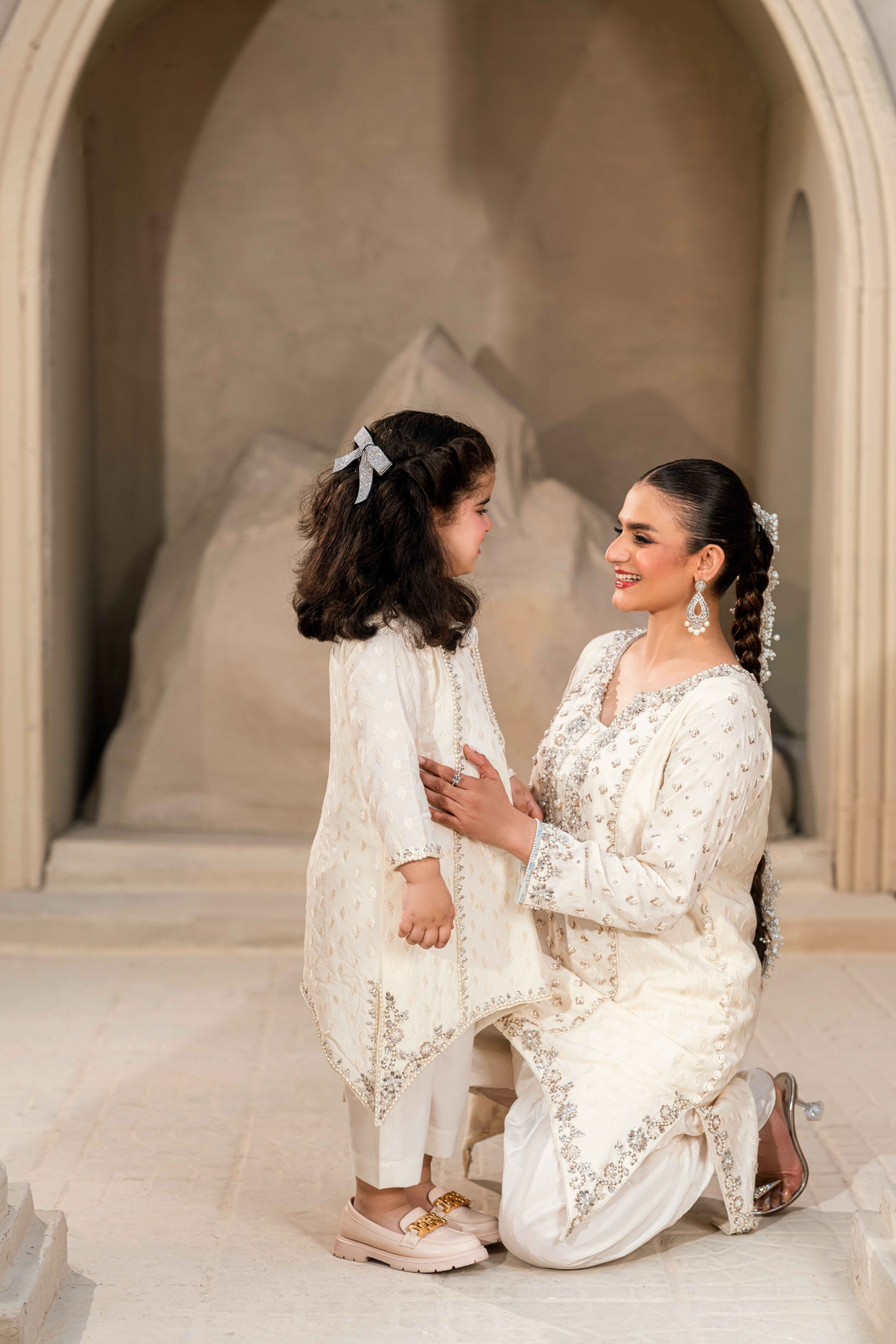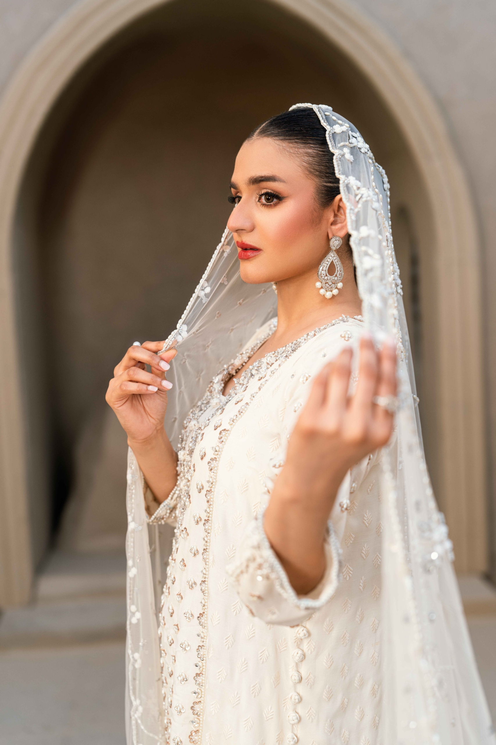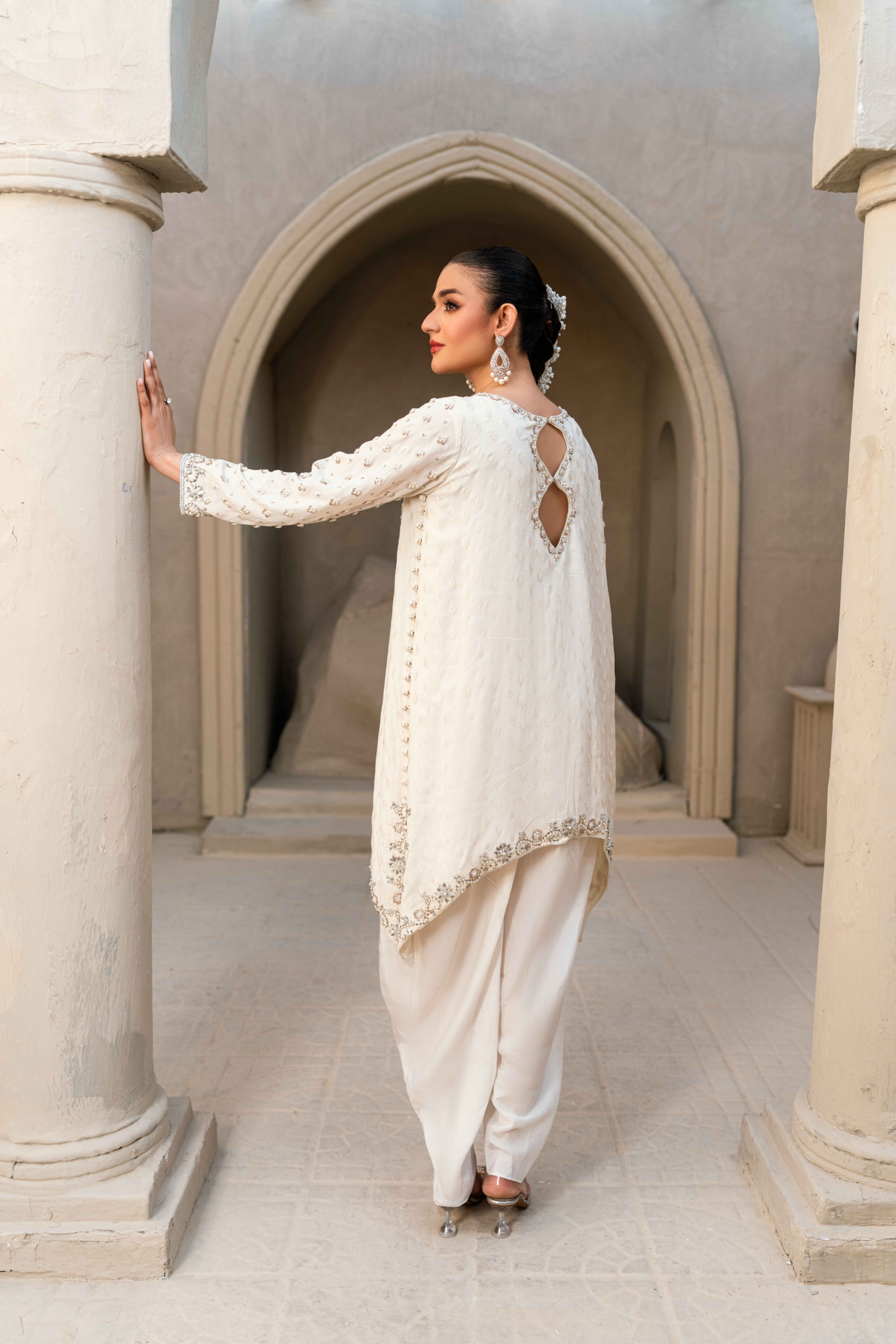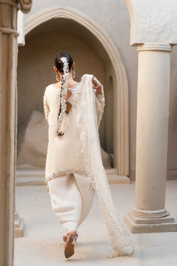 Details “Ethereal elegance! Hira Mani exudes refinement in our exquisite off-white A-line frock, expertly paired with a tulip shalwar and intricately embellished jaali-style dupatta. Delicate handmade flower buttons, luminous pearls, and precision-crafted embellishments adorn this Eid masterpiece, rendering it truly unforgettable.