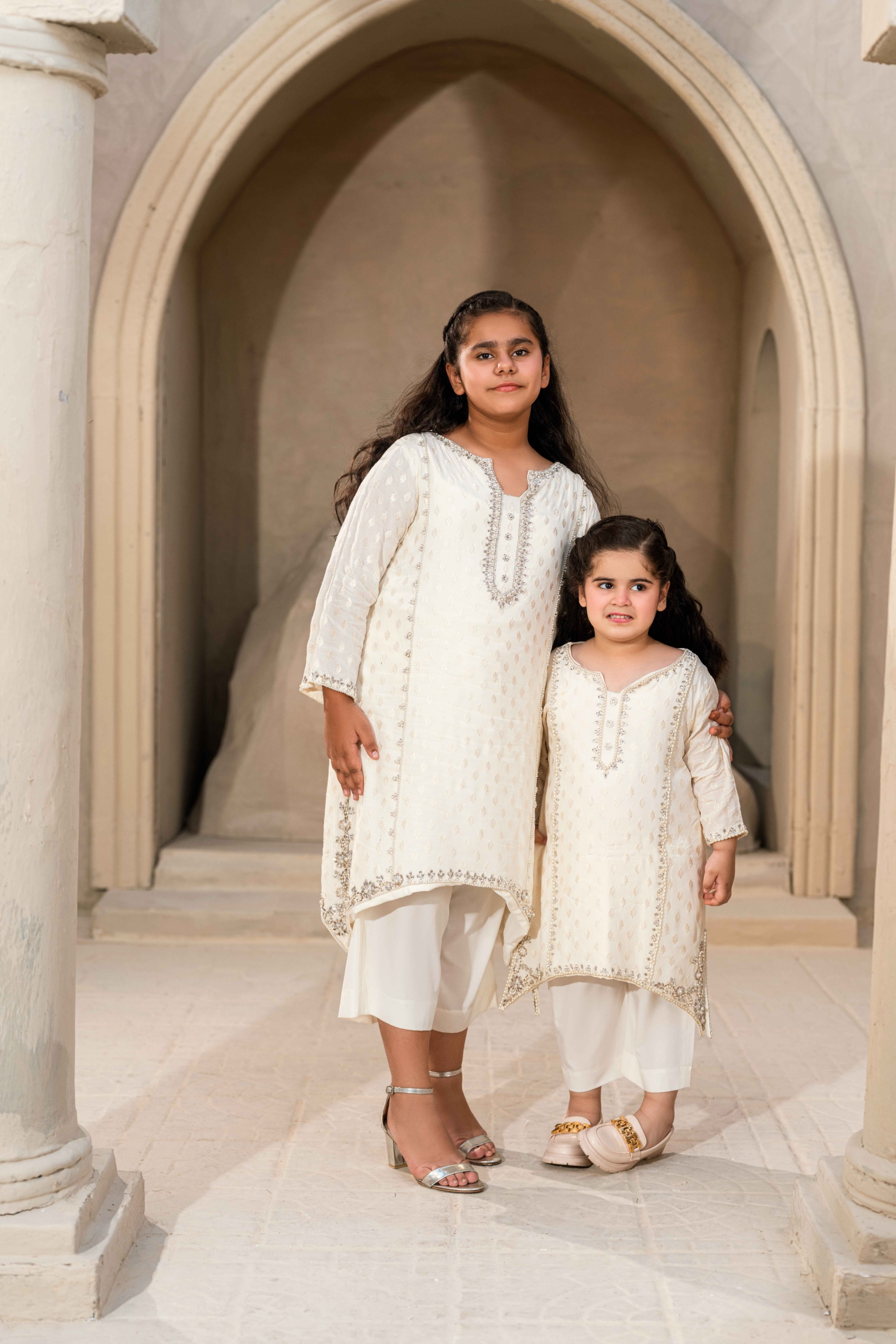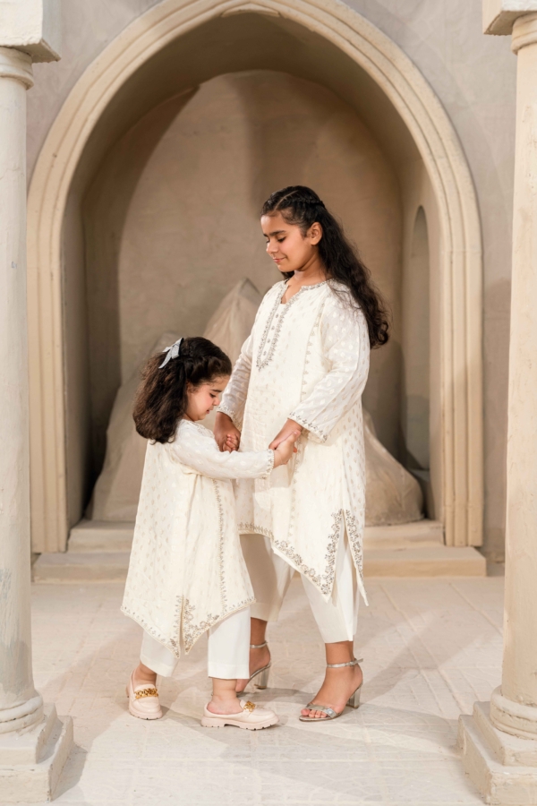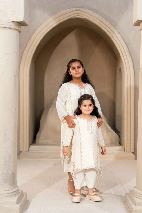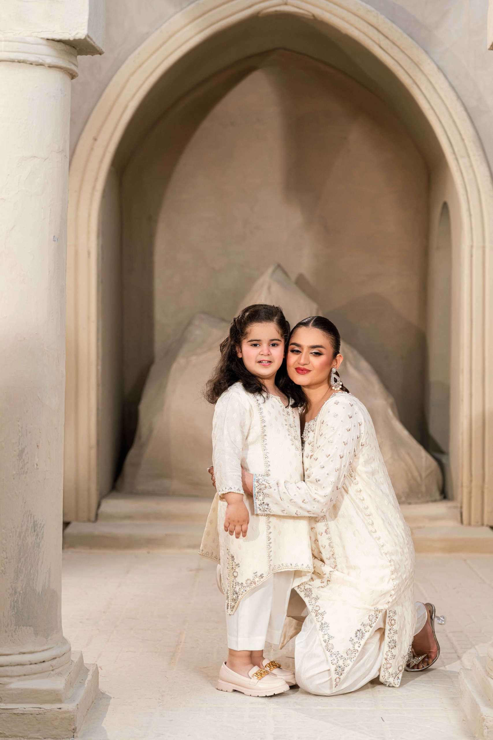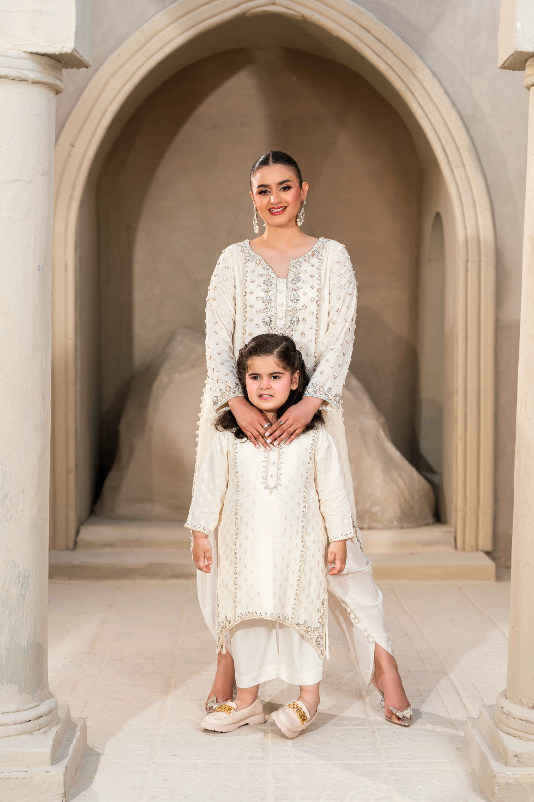 Details “Ethereal elegance! Hira Mani exudes refinement in our exquisite off-white A-line frock, expertly paired with a tulip shalwar and intricately embellished jaali-style dupatta. Delicate handmade flower buttons, luminous pearls, and precision-crafted embellishments adorn this Eid masterpiece, rendering it truly unforgettable.