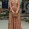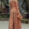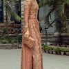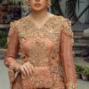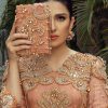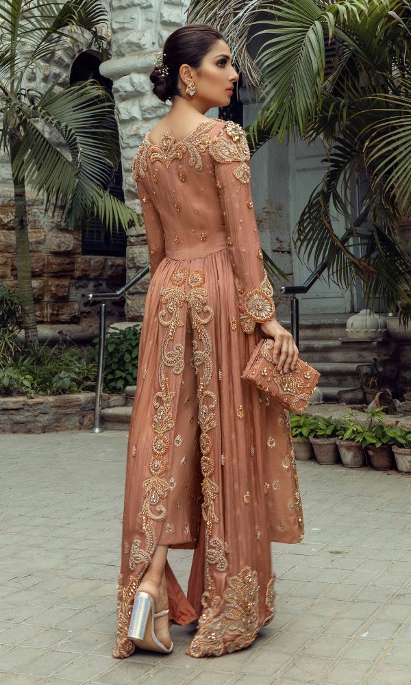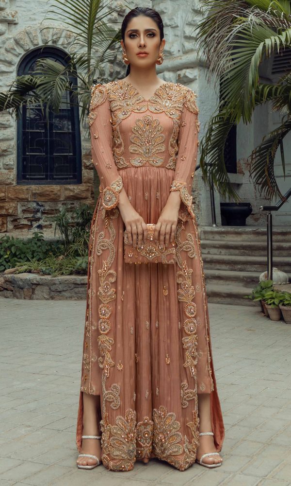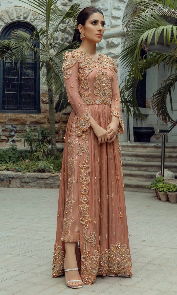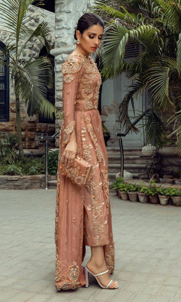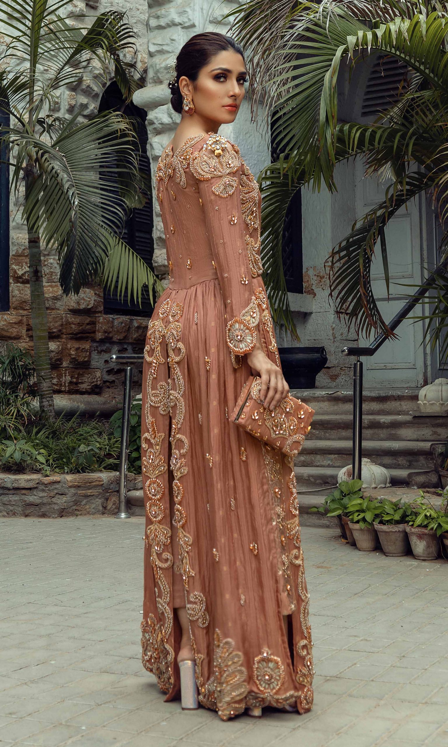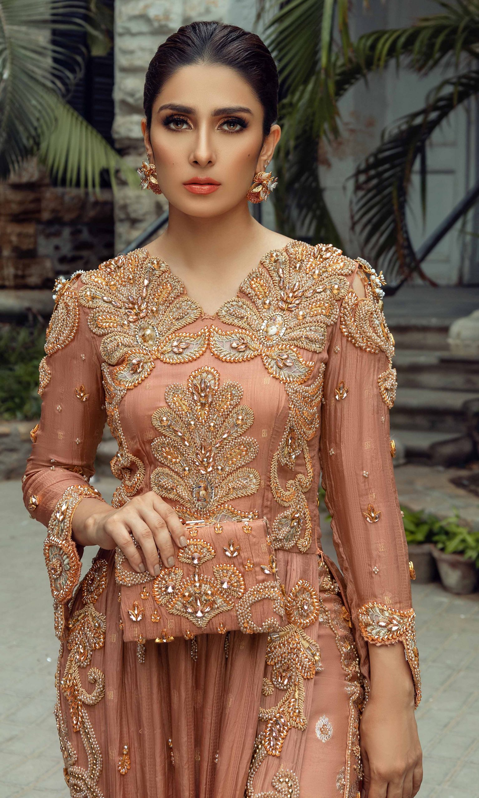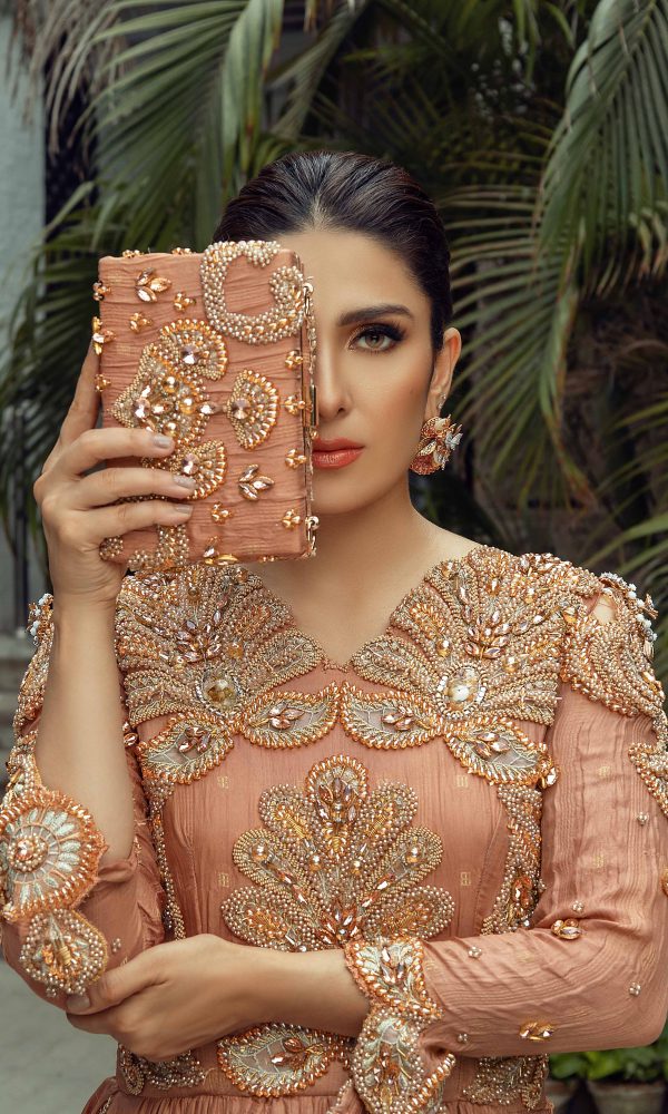 Featuring Ayeza Khan in Komal Chawla’s new collection. Set on a pure dull silk fabric the hue of tea pink crush texture is exquisite. Knitted with a banarasi bootie with floral detailing this outfit gives a rusty look with a blend of ornaments.