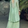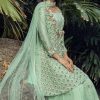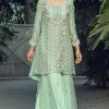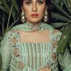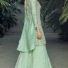 Featuring Ayeza Khan in Komal Chawla’s new collection. A splendor outfit layered over pure masuri silk is knitted with a golden bootie. The pastel shade of mint green on angarkha style tail frock with bustier uplifts its beauty. The outfit is paired with Dhaka style pajamas as the metallic and stony ornaments mingle all over