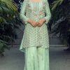 Featuring Ayeza Khan in Komal Chawla’s new collection. A splendor outfit layered over pure masuri silk is knitted with a golden bootie. The pastel shade of mint green on angarkha style tail frock with bustier uplifts its beauty. The outfit is paired with Dhaka style pajamas as the metallic and stony ornaments mingle all over