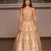 Be part of our eternal royalness, breathtaking Ayesha Toor portrays as our canvas for Komal Chawla’s Bustier with back self-printed white cape skirt. The pure atlas and organza serve as our canvas with flowing ethereal golden silhouettes embellished with Cora, dapka, and gijyayi. To give our dress a 3D look we incorporated Doori with wooden carved pieces and structured ornaments like stimins, ceramic flowers, and 3D flowered pearls. Swathe yourself in this luxurious epitome which is Tóur de Force.