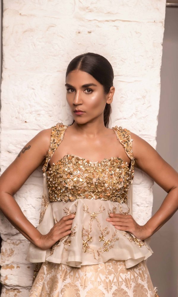 Be part of our eternal royalness, breathtaking Ayesha Toor portrays as our canvas for Komal Chawla’s Skirt and Peplum top with Cape. A refine faired silhouette in white and gold is embellished with gold and silver rings, exquisite pearls, and metallic leafs LC color stones in different formations with pearls and beads. The peplum top held by transparent straps is paired with a skirt adorn with zero-size ornaments with the glamorous cape loaded with Cora, dapka, and crystals. A plentiful visionary is Chef-d’œuvre.