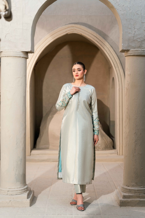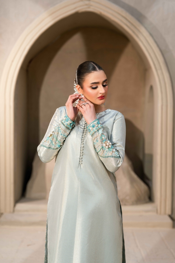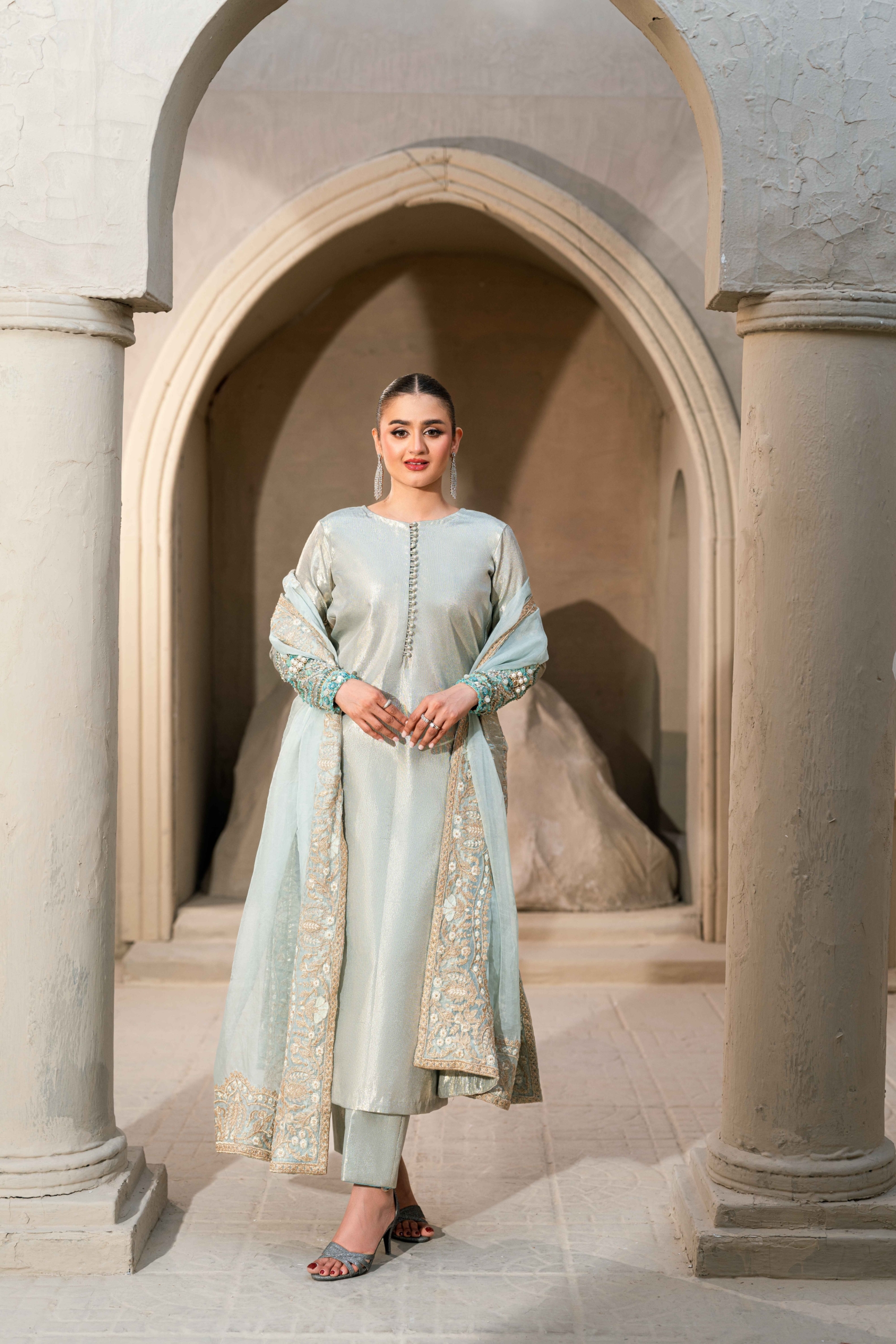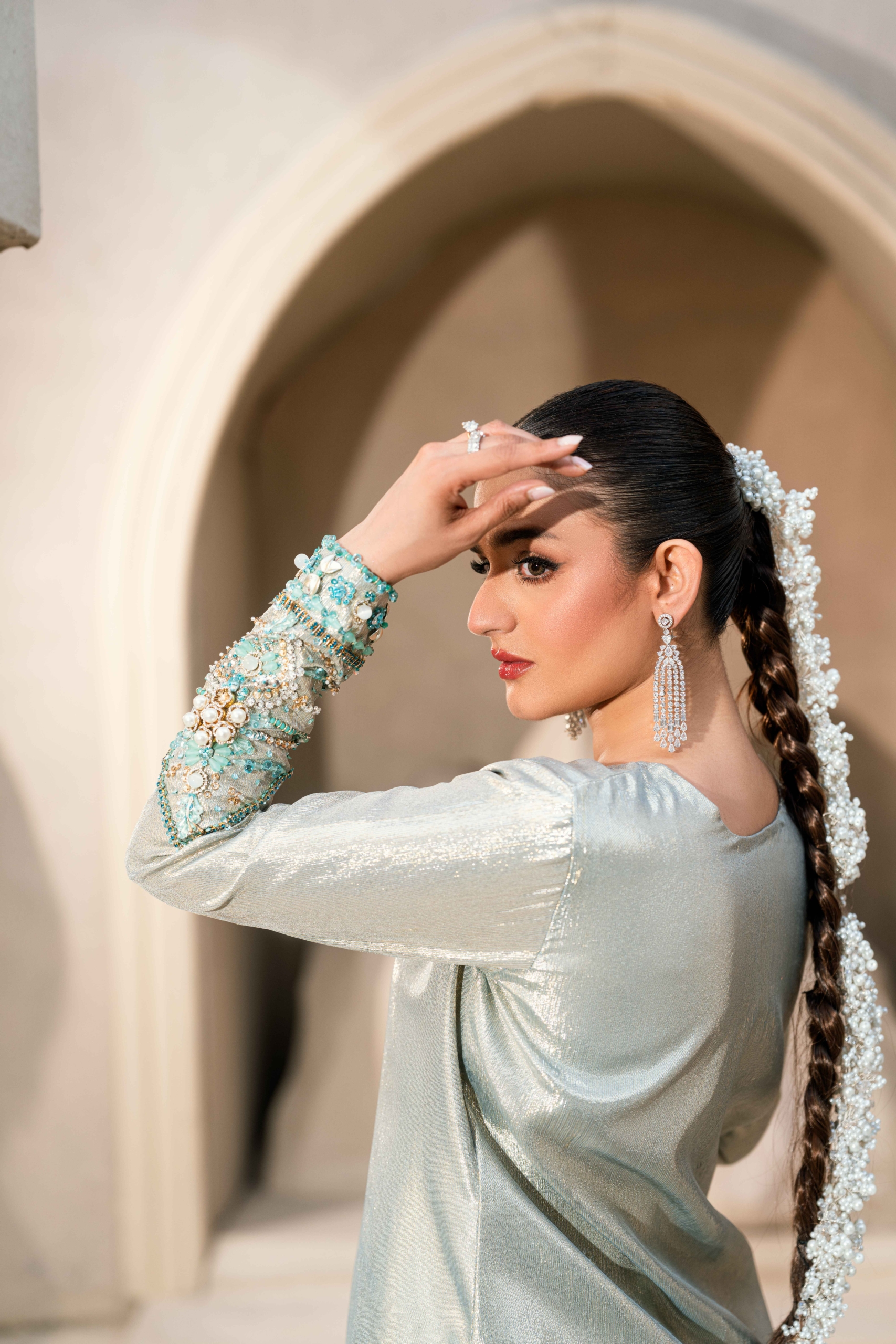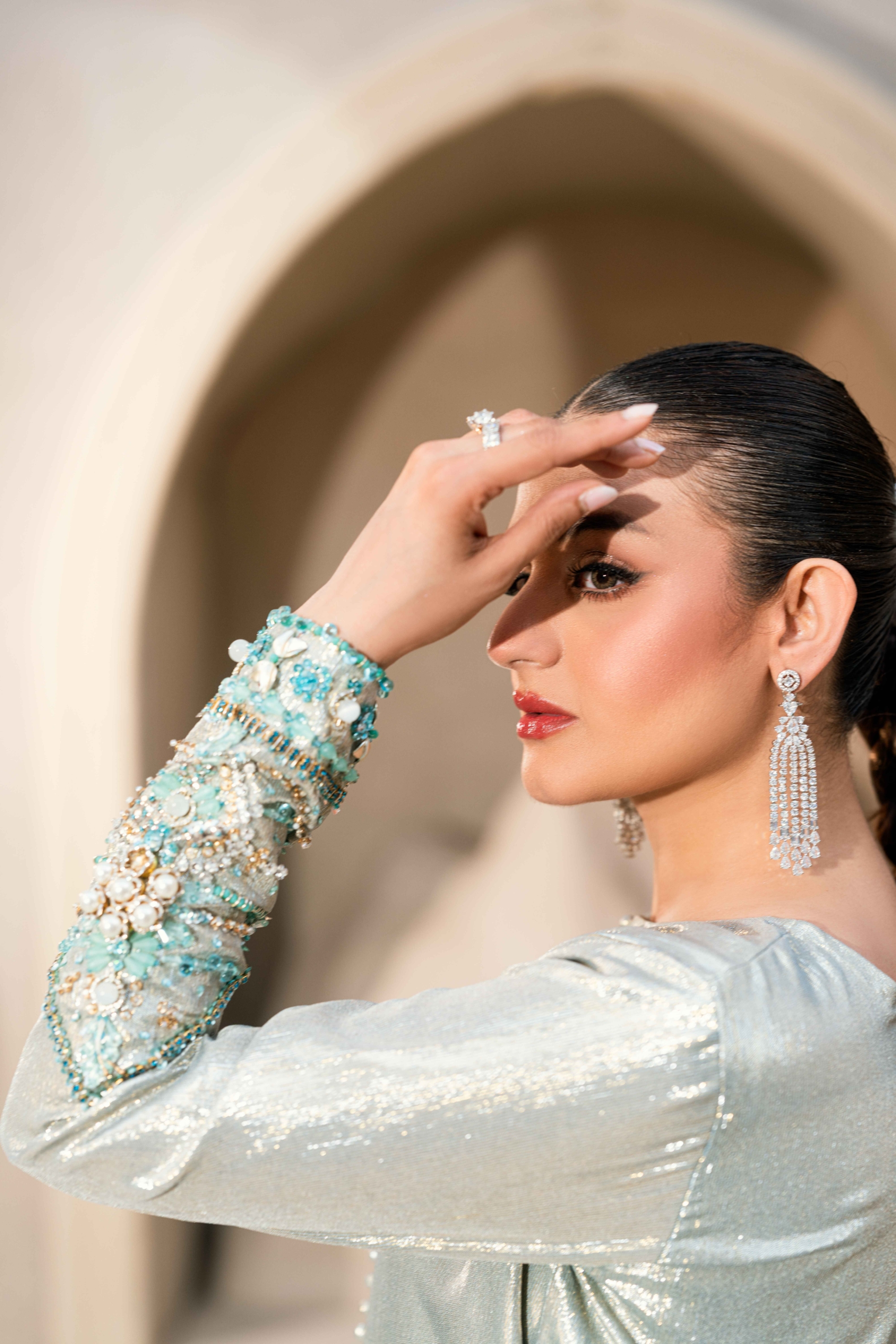 Details “Hira Mani shines bright in our dazzling Eid collection! This stunning Turquoise color Glittery Silver, Golden, and Copper crushed fabric shirt and pants is a must-have for Eid celebrations. Featuring intricate details like buttons with loops, sleeves embedded with metallic pearls, florals, and leaf-shaped stones, and paired with a beautifully machine-work embroidered dupatta