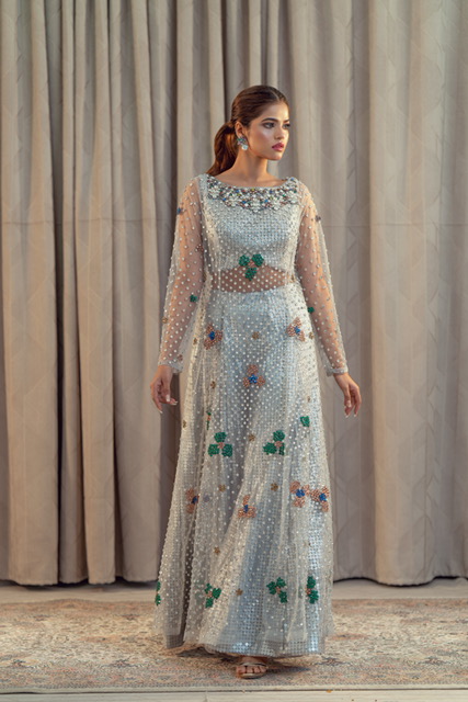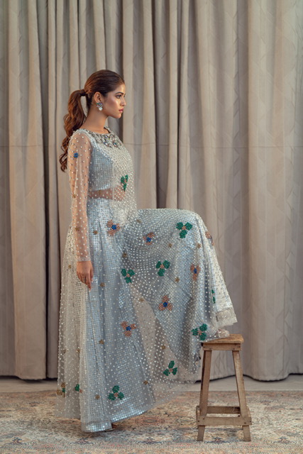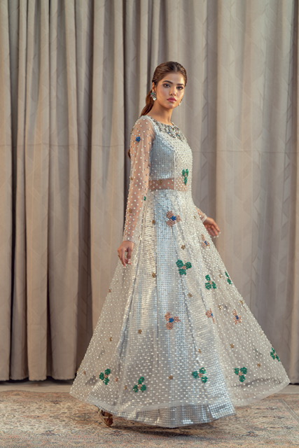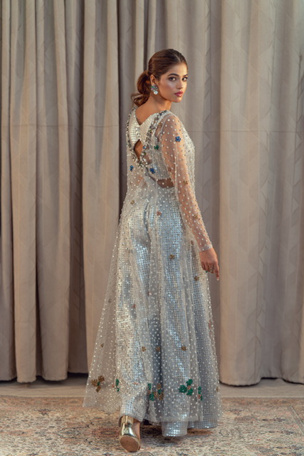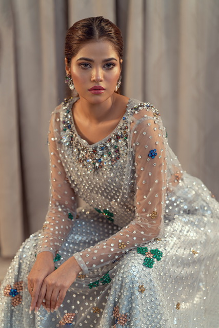 Presenting to you Elina Batool in our yet another prestigious collection. Indulge in our luxurious princess paneled frock elaborated in hues of Swarovski. Paired with sequence blouse and loose ijar the outfit creates an irresistible look for all occasions.