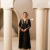 Details “Hira Mani dazzles in our regal Black Knitted Booti Anghrakha frock, perfectly paired with a stunning embroidered choridar. Delicate Dapka, pencil crystals, leaf-shaped stones, crystals, Tikki stones, Cutdana, and sequins come together in a beautiful blend of traditional charm and modern glamour. A true Eid showstopper!