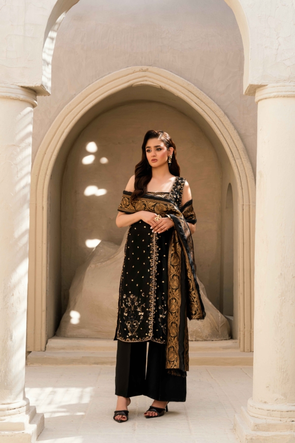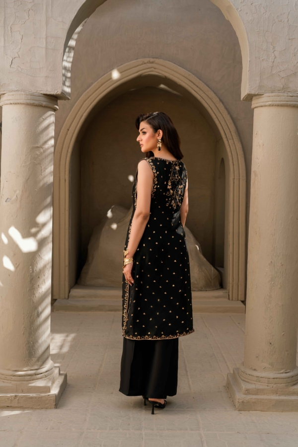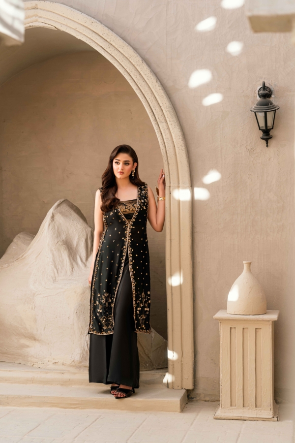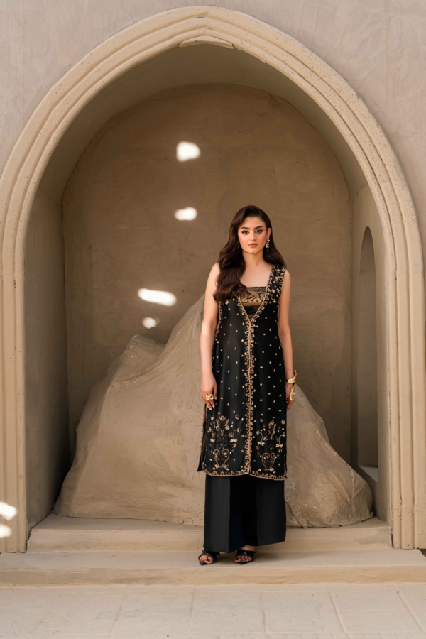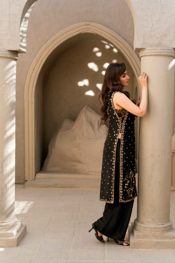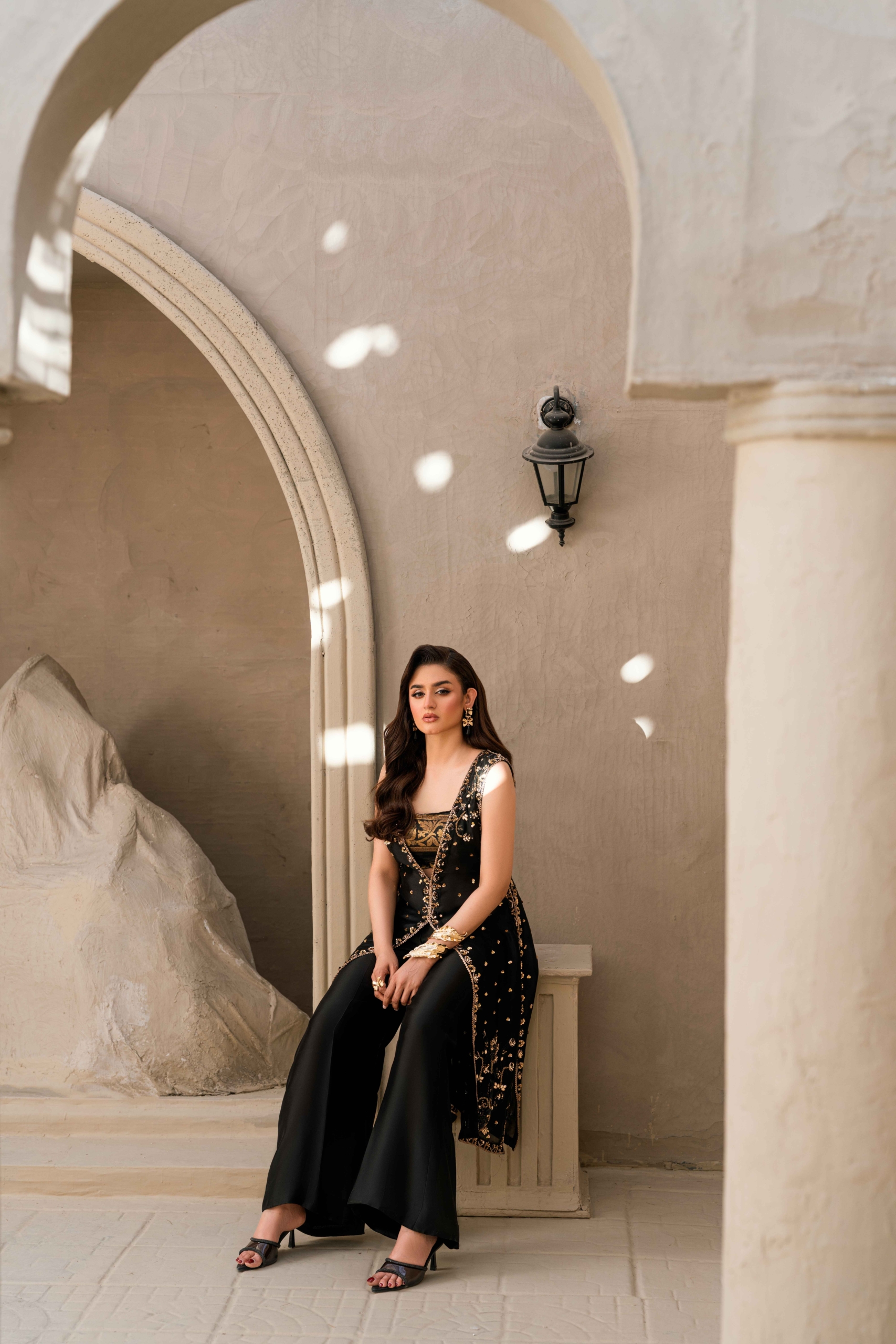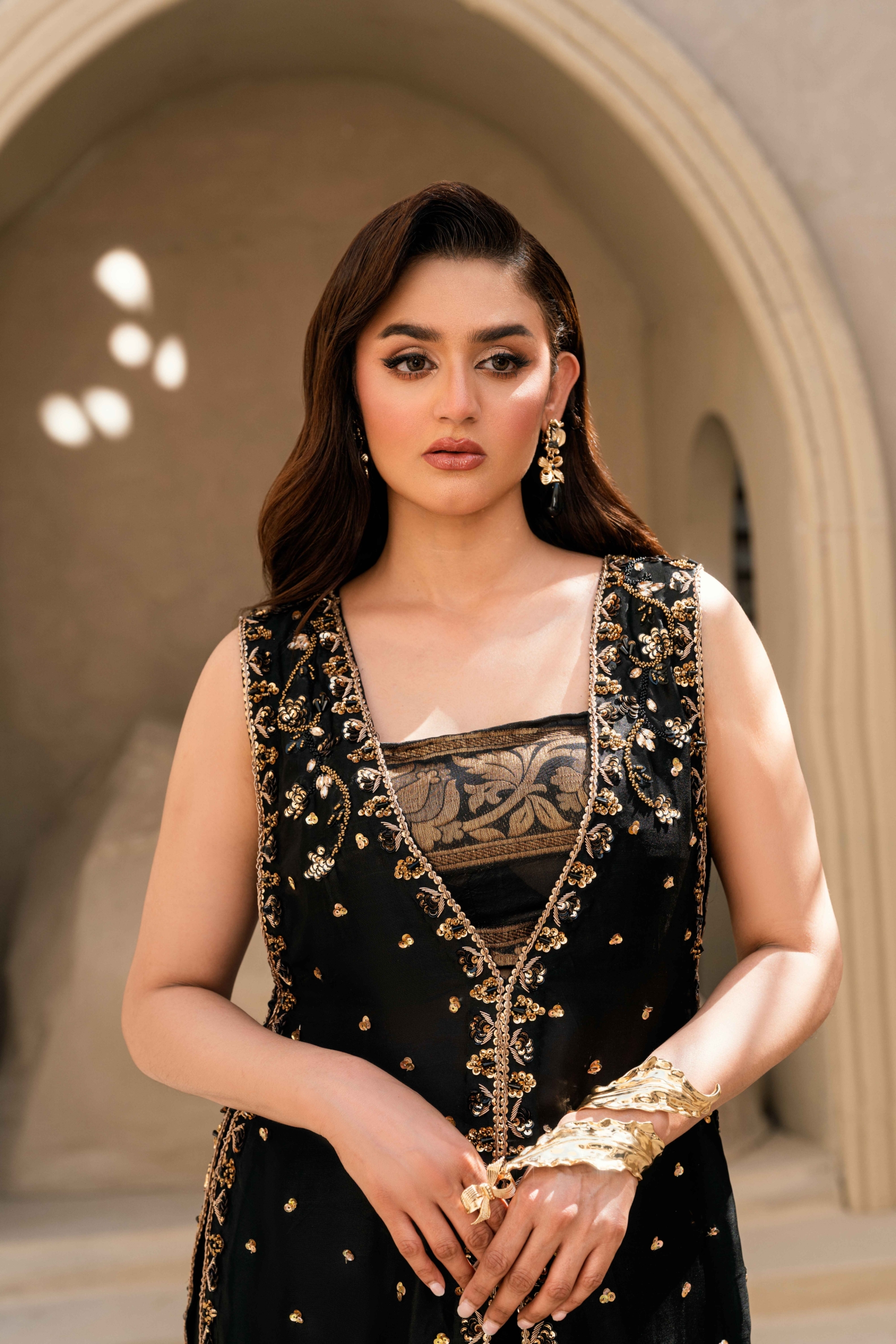 Details “Hira Mani exudes sophistication in our stunning Black Sheesh Silk Eid ensemble! This centre-slit straight shirt with side slits is paired with a pure Atlas blouse and Sheesh Silk bell-bottoms, creating a dramatic silhouette. The outfit is intricately detailed with embroidered Kora Dapka, Cutdana, leaf patterns, metallic rings, Tikki stones, and pencil crystals, adding a touch of luxury to this Eid masterpiece!