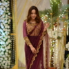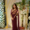 Including: The saree is embedded on a grey net fabric embellished with 3D crystals. Mesmerizing full sleeves blouse evince in peach color with metallic rings and pearls gives signature royal style. The material is kora dapka with combination of seven stones tackled with gleamy crystals and pearls. An indigenous artwork which is pièce de résistance.