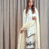 Silk straight shirt blending with culottes and organza dupatta. This striking outfit is swirled with black sequence and milky ornaments giving a bold look for the winter season.