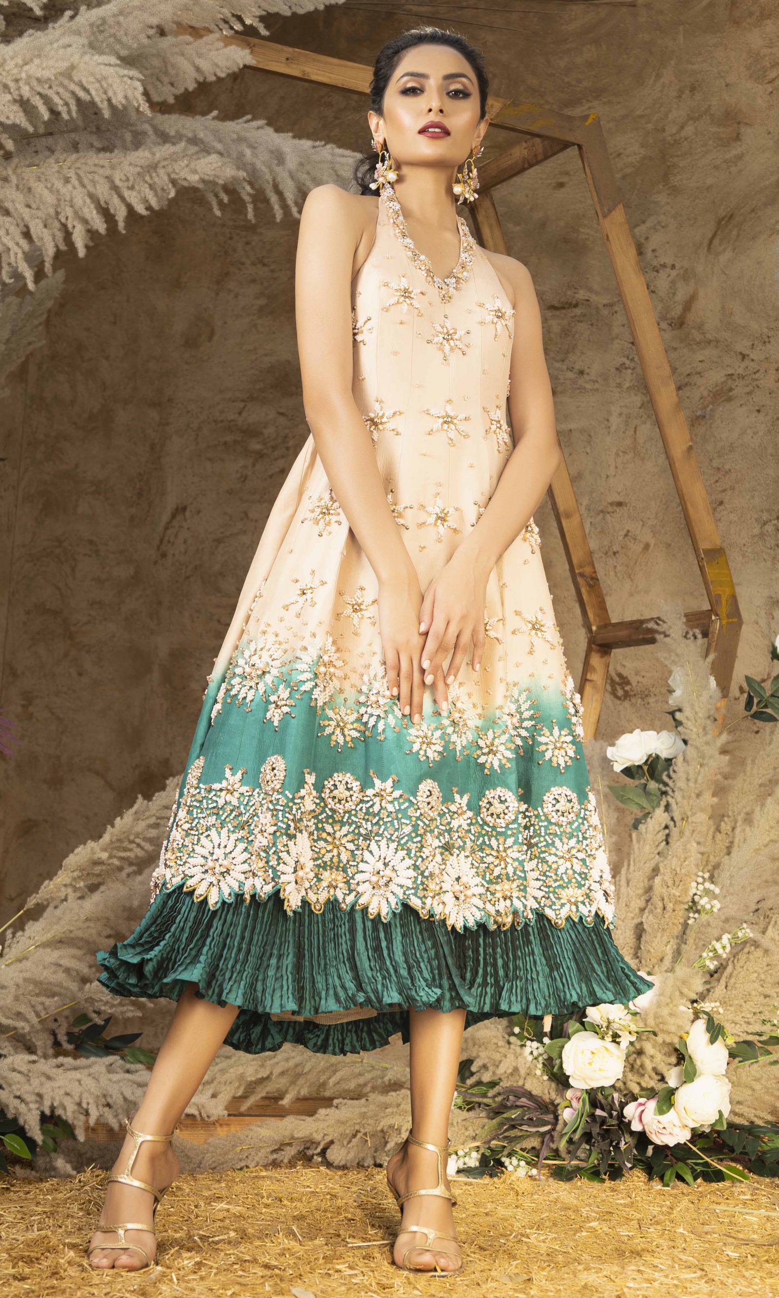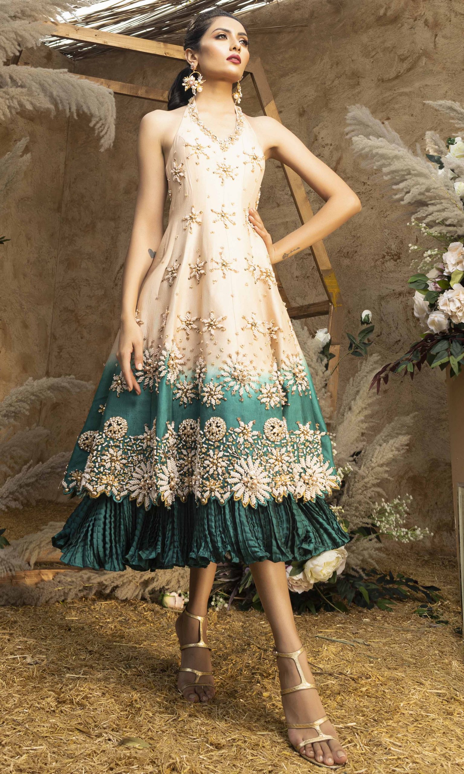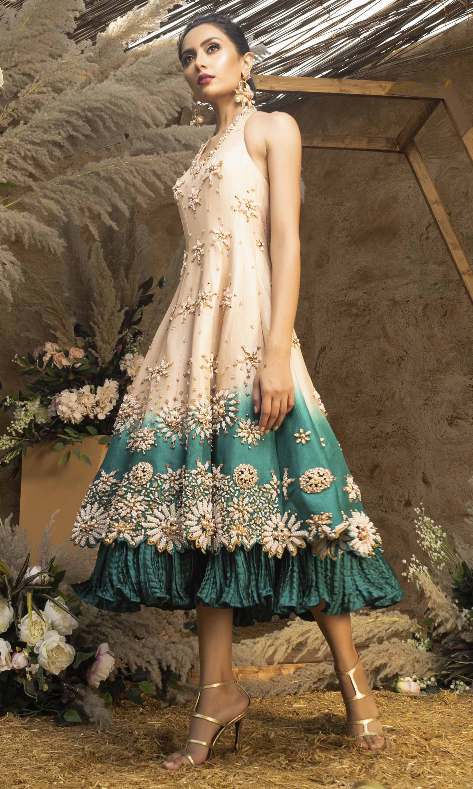 The meticulous ankle length double shade frock is fit for exquisite canvas. The crushed ruffles layered with cancan provides versatility, accompanied by our masterwork of ornaments