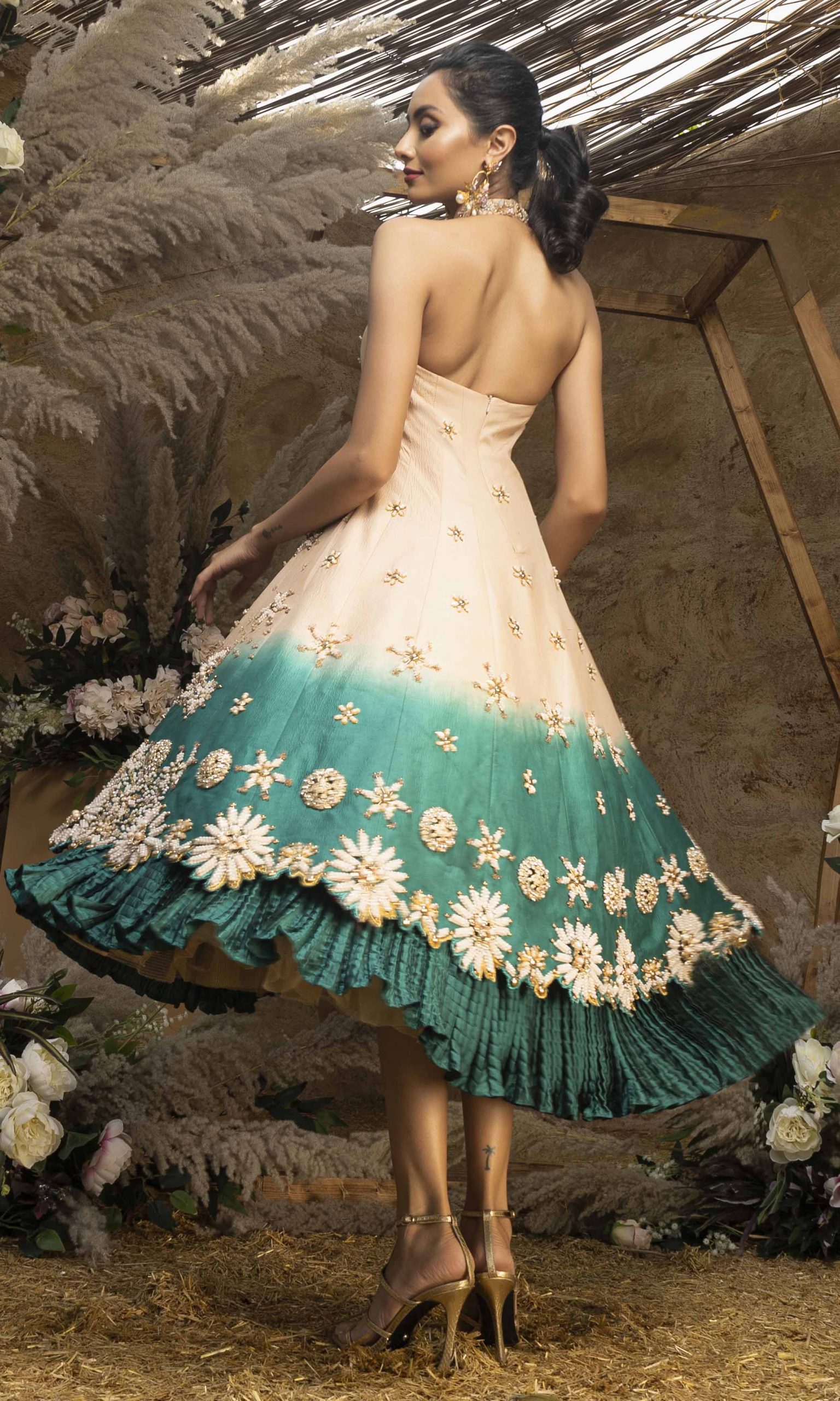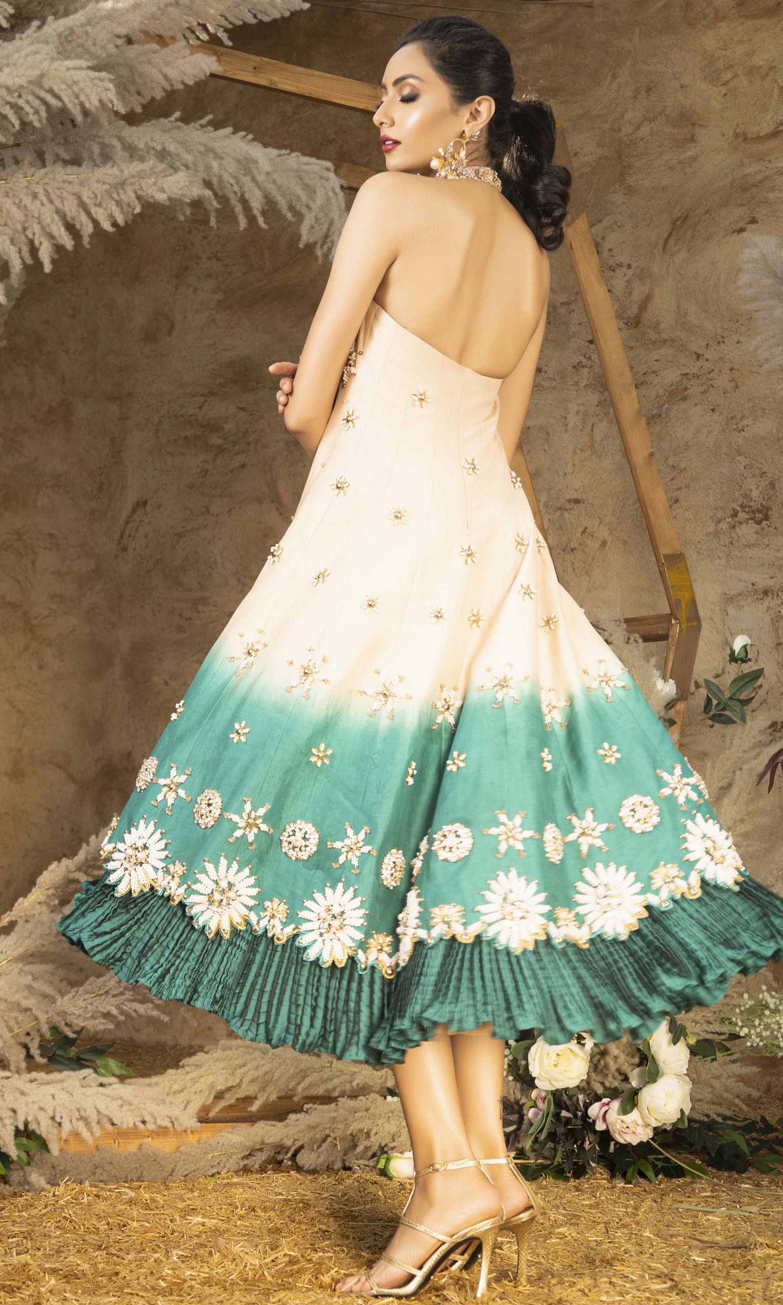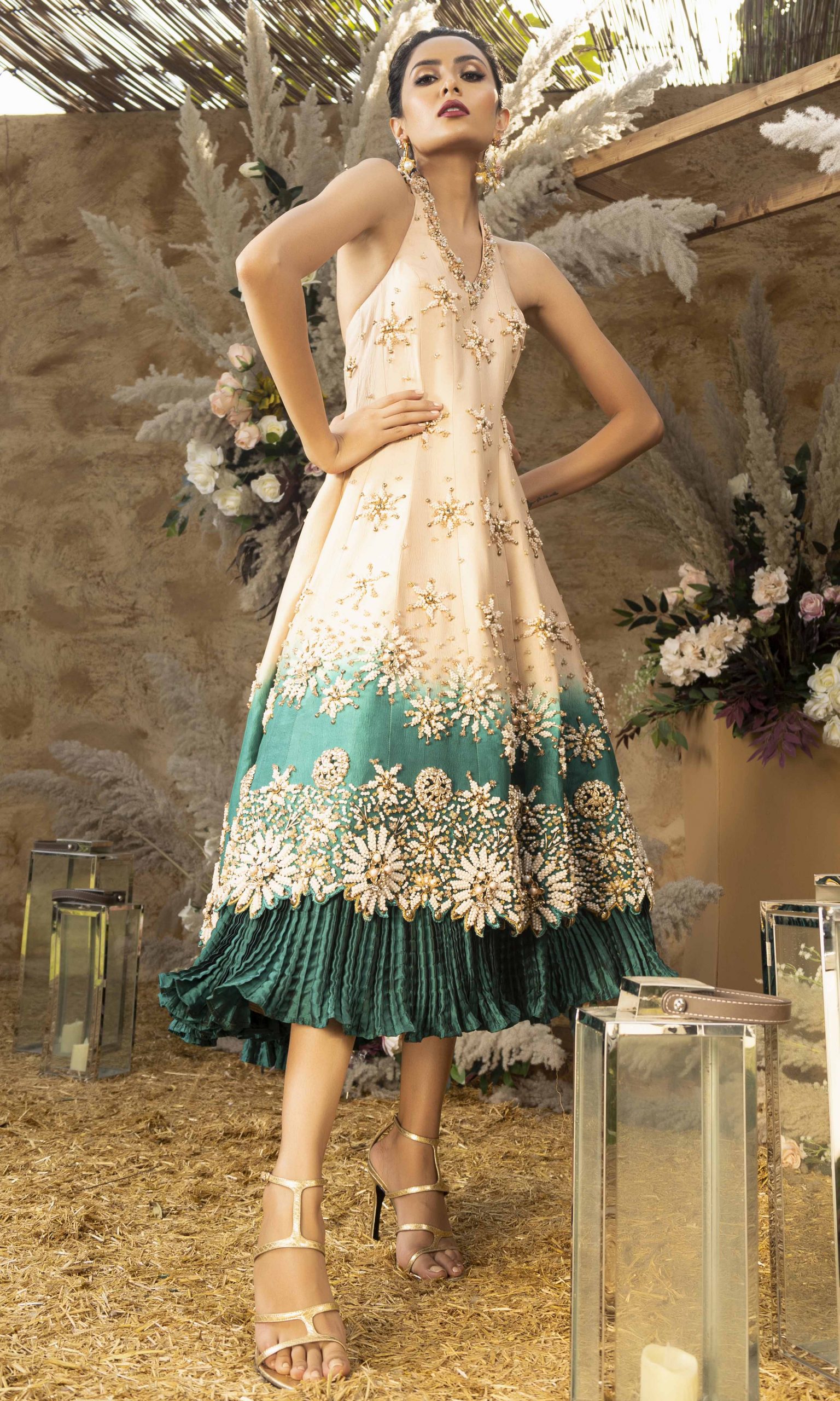 The meticulous ankle length double shade frock is fit for exquisite canvas. The crushed ruffles layered with cancan provides versatility, accompanied by our masterwork of ornaments