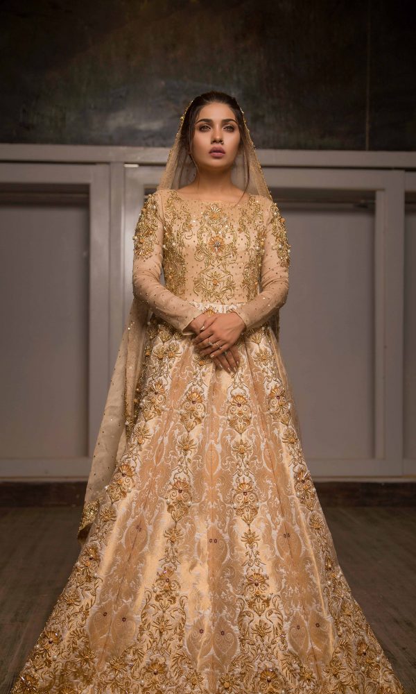 Relay with our eternal royalness, stunning Mahi Baloch portrays as our canvas for Komal Chawla’s massuri chiffon and atlas gown. A virtuoso white and gold paneled gown is layered with contrasting indigenous 3D-shaped pearls and supplementary embroideries. Paired with embellished kora dapka dupatta with tassel detailing. An indigenous artwork is pièce de résistance.