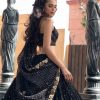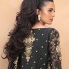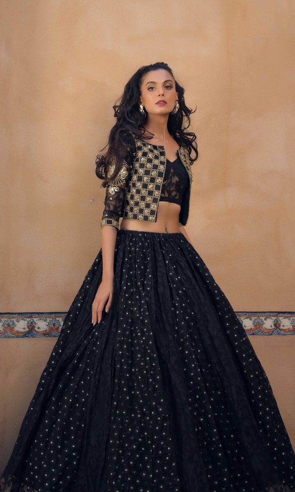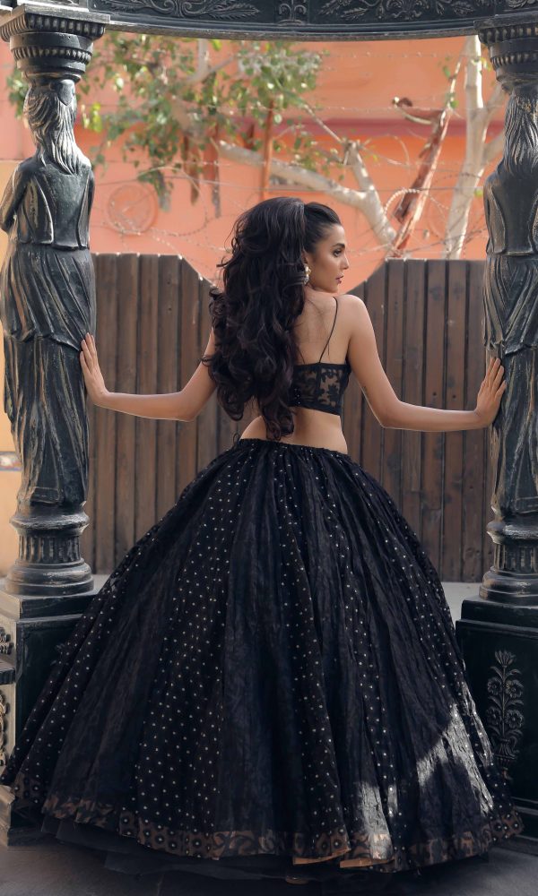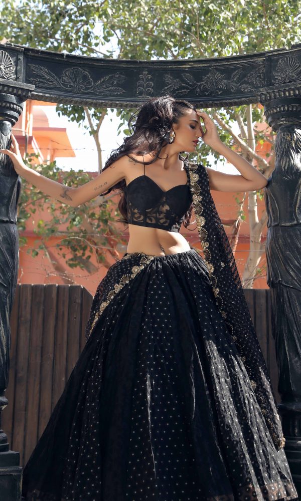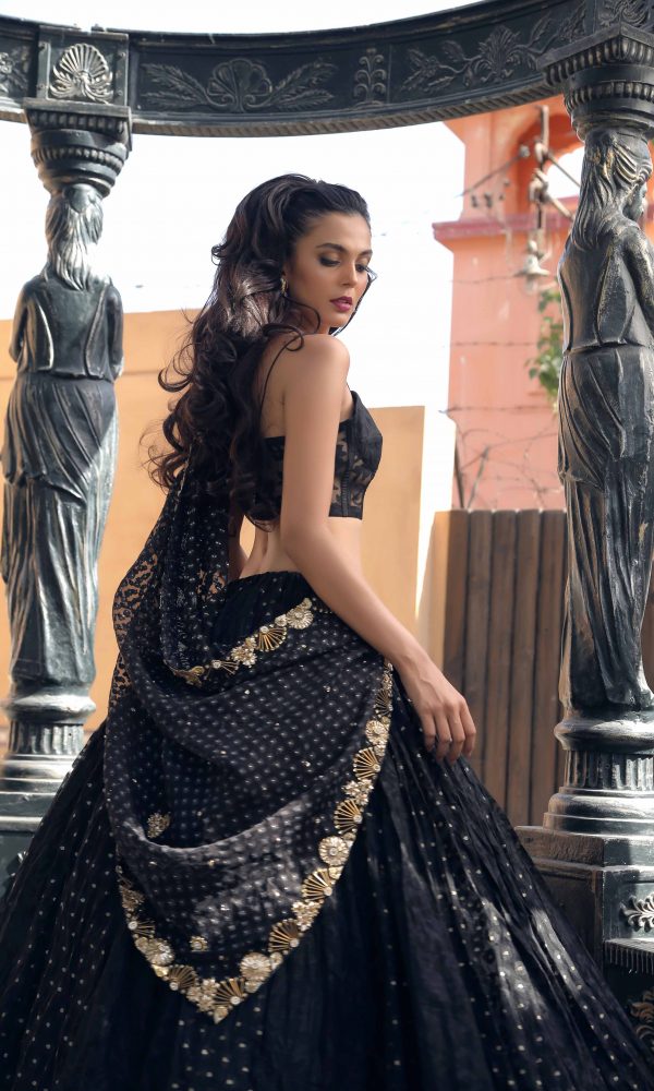 An opulent black corset with pleated and crushed skirt introduces ravishing Mushk Kaleem. Embedded on a self-print jute net and with golden flowers, the outfit has shining ornaments with tiny studs, metallic rods, and gotta flowers paired with an embellished blazer. The perfect add-on is of golden floral bootie dupatta as the black color vigilantes the perceived beauty of our outfit.