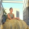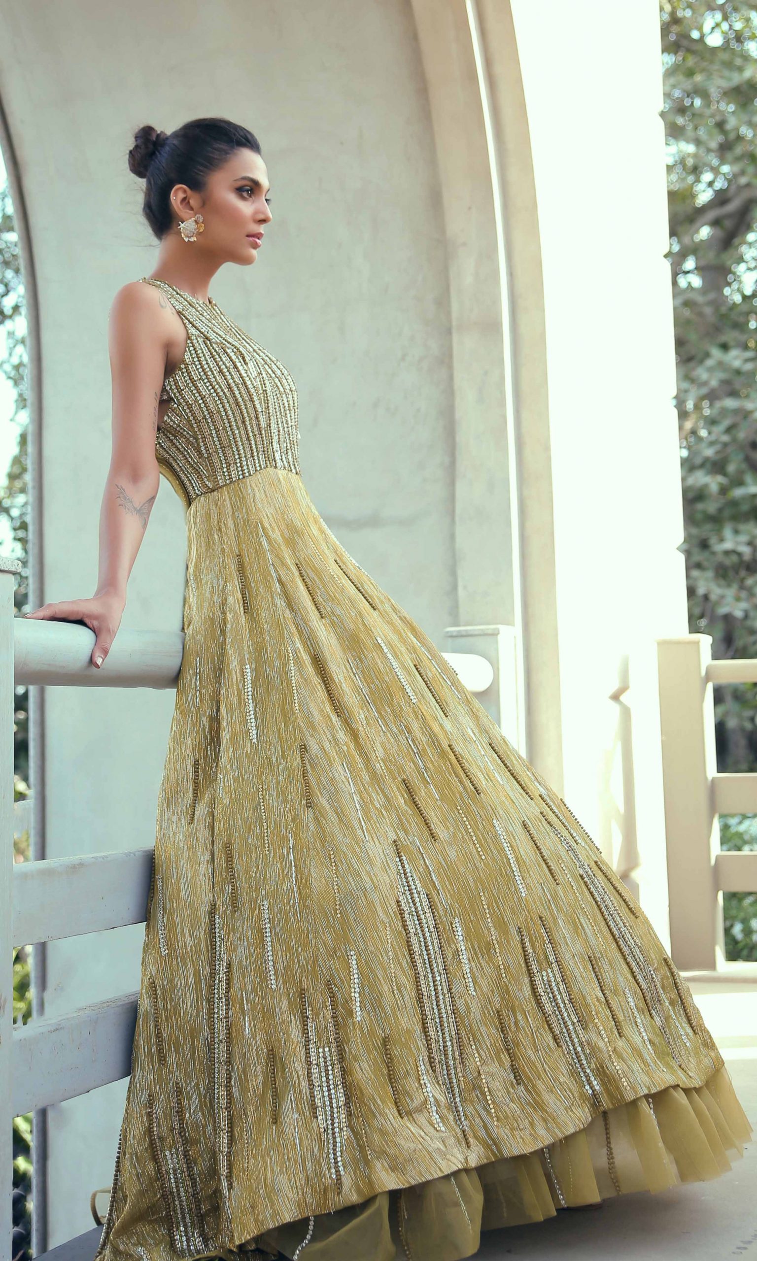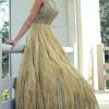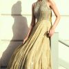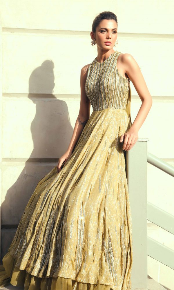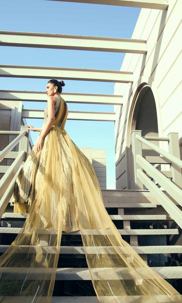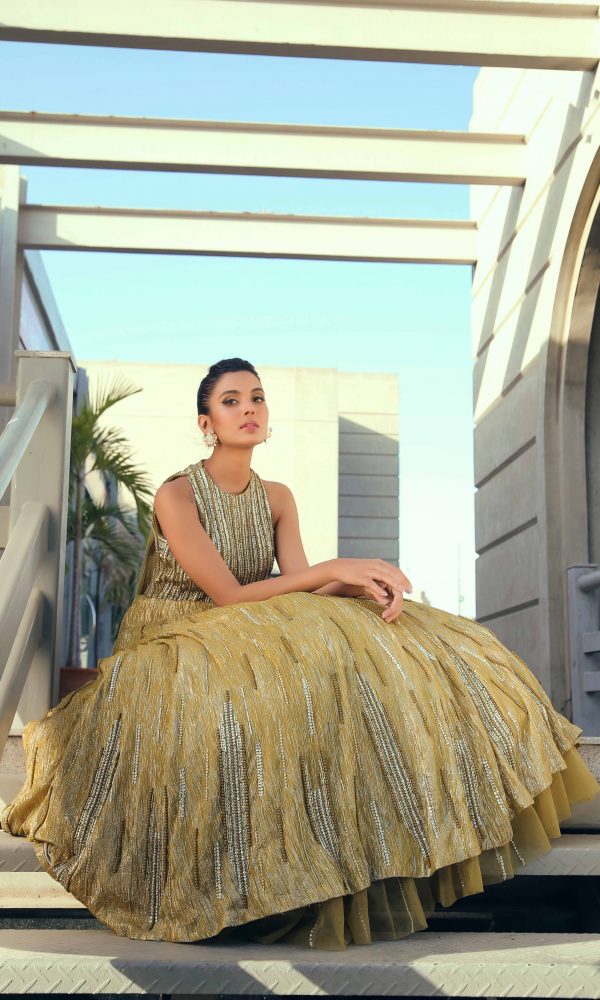 Make way for our grandeur olive-green halter neck gown. This luxurious gown is stitched in a button-down style draped with a net at the back. The cape tail is stretched from the back ending with net ruffles with a smoldering look glorifying the entire outfit shining by crystal stones and ornaments.