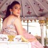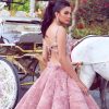 Catch Mushk Kaleem in an exquisite ballerina pink bustier with a puffy paneled low waist skirt. The outfit is layered over a karandi net and hand-stitched floral metallic bootie which shows our craftsmanship. The frill technique stands out with metallic and 3D-shaped ornaments enlightening full sleeves tail cape too. A prolific vision is Séduisant.
