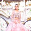 Catch Mushk Kaleem in an exquisite ballerina pink bustier with a puffy paneled low waist skirt. The outfit is layered over a karandi net and hand-stitched floral metallic bootie which shows our craftsmanship. The frill technique stands out with metallic and 3D-shaped ornaments enlightening full sleeves tail cape too. A prolific vision is Séduisant.