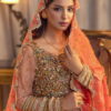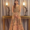 Peach front open Panneld organza frok with Atlas linnings paired with self print organza skirt and Candy pinky dupta Embellished with lots of flower shape bunties, Ceramic flowers, Swarovskies, tikki stones, Stimins, pearls, crystals, Metallic leaf, Pearls with the detail of net,Loaded kora dapka.