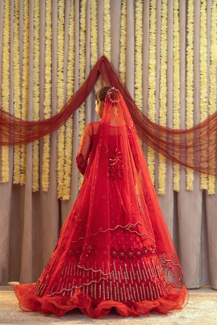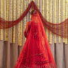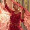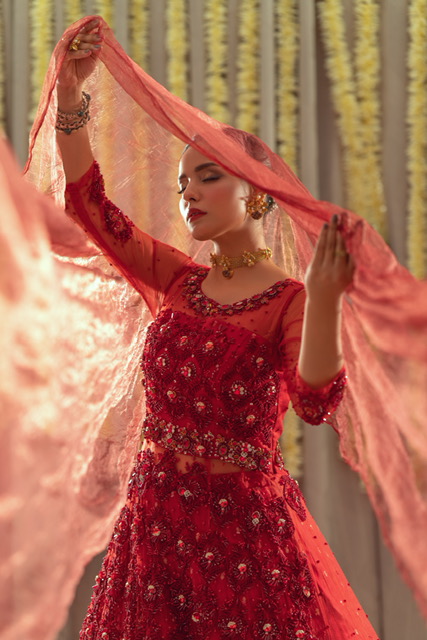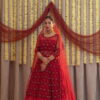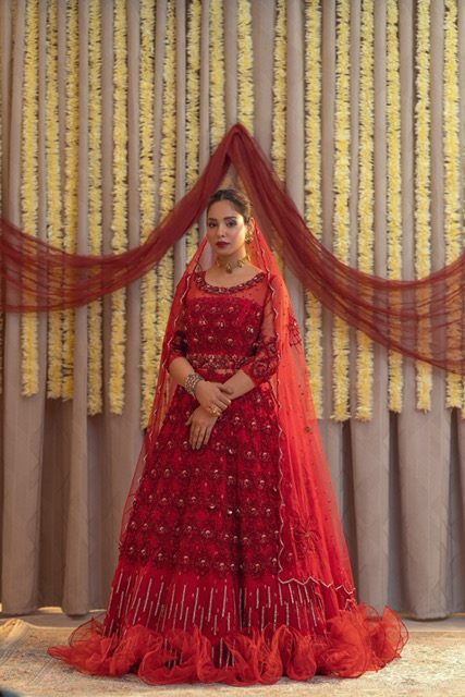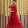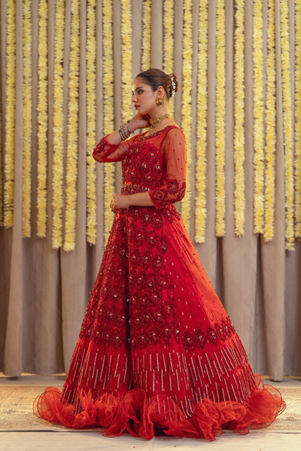 Rendered over in hue of pomegranate shade Komal Chawla presents panneled frock with organza and net truffles. The style is embedded over net and silk paired with scalloped dupatta shining with Komal Chawla’s equiste hand work.