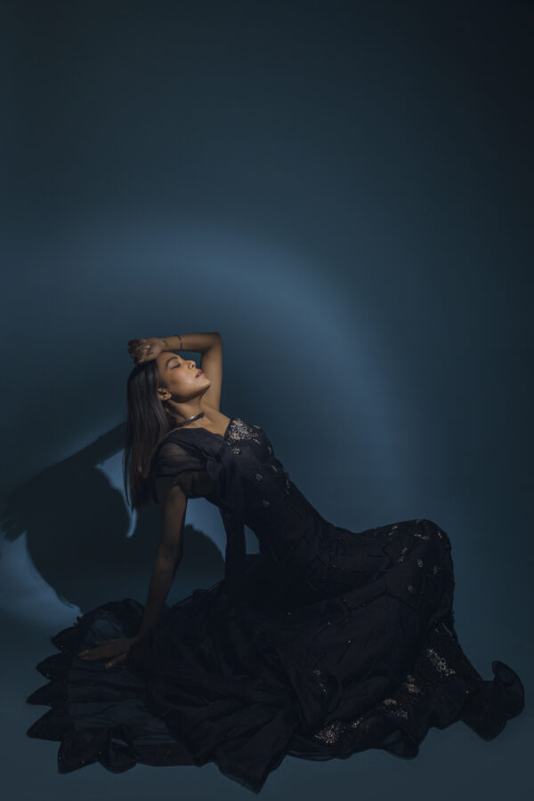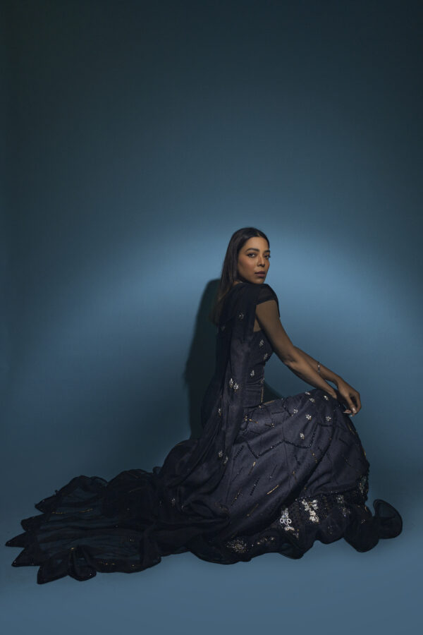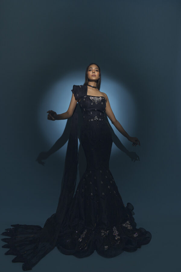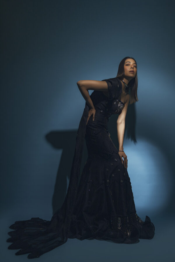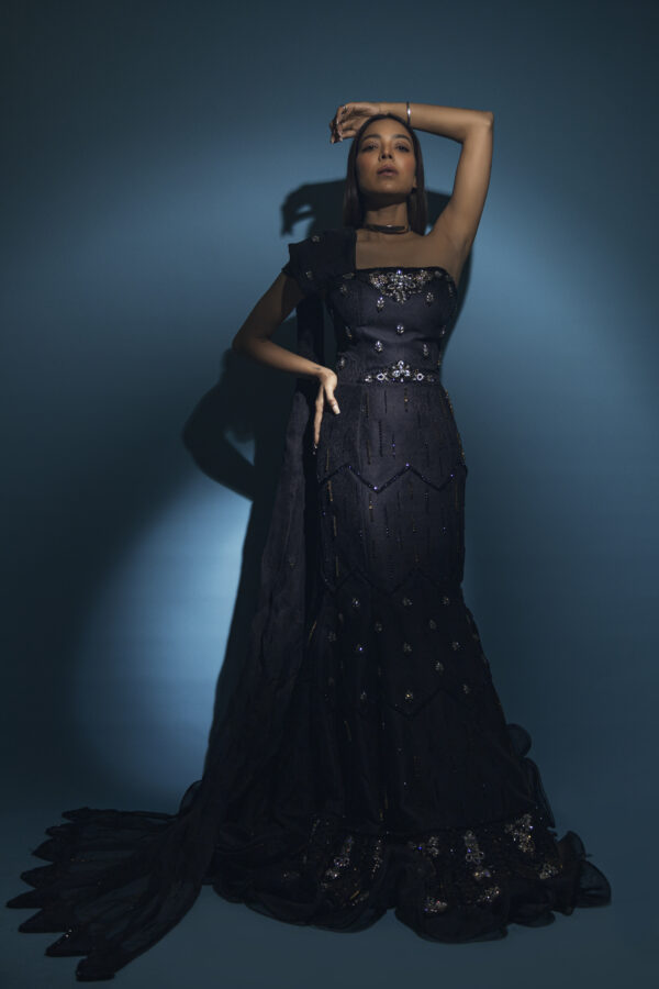Including: The mermaid bustier gown is styled in an asymmetrical design with pleats sporting the one shoulder falling dupatta. The black beauty is pasted with handcrafted ornaments with layered ruffles uplifting the design.