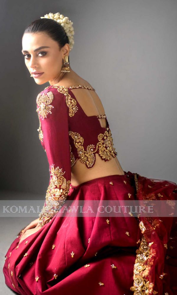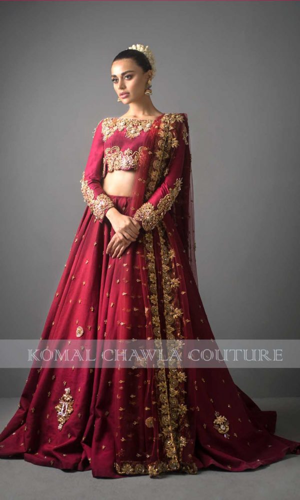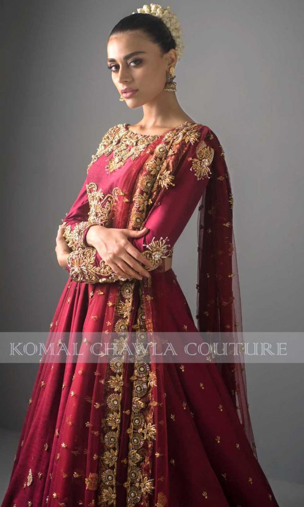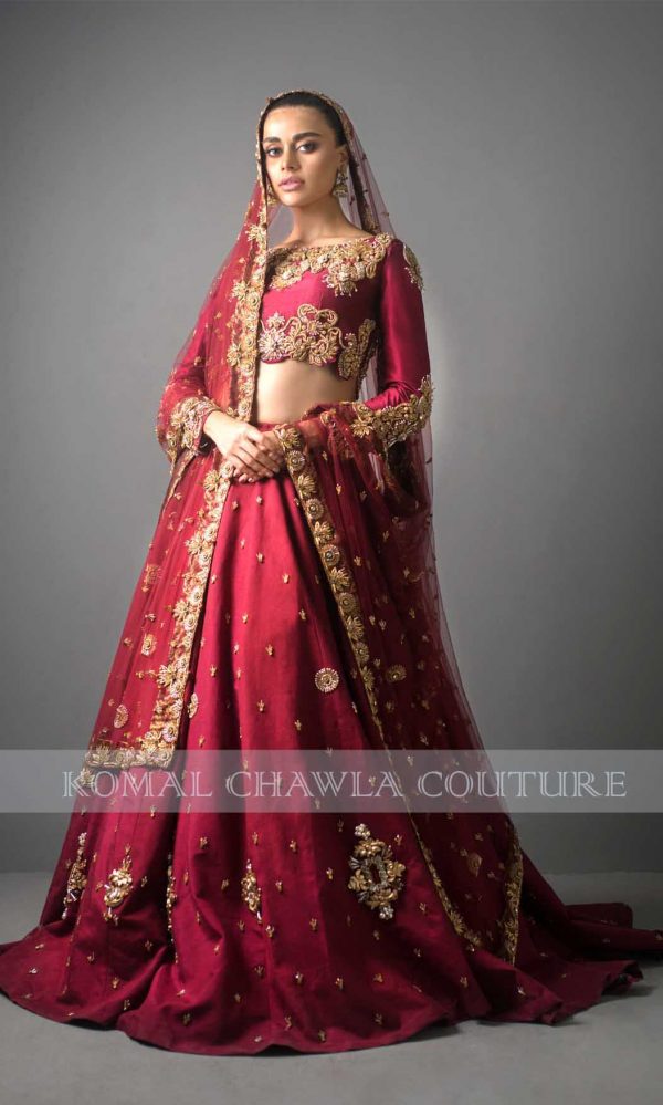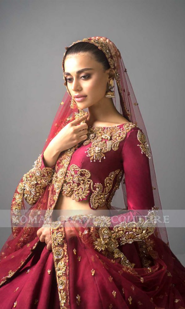 Be part of our eternal royalness, coquettish Sadaf Kanwal portrays as our canvas. Embrace the hue of dusty rose which produces a unique palette of color. Embodying style with crop top with strapped back on net with full bias skirt at the back. The dress owns exquisite ornaments with dapka, pearls, and crystals supporting the metallic crafting. A luxurious epitome that is Tóur de Force