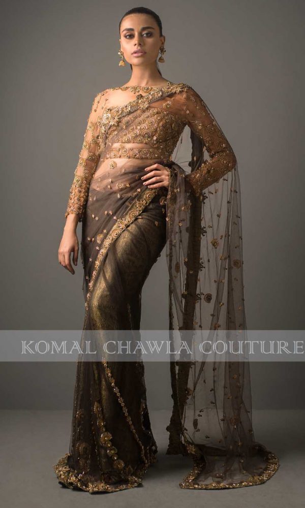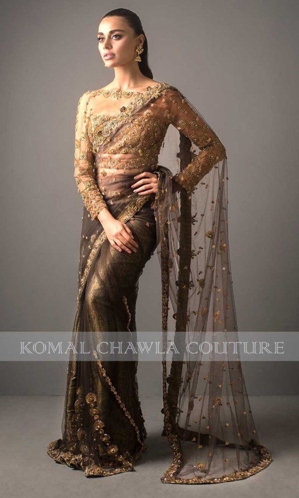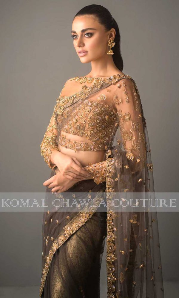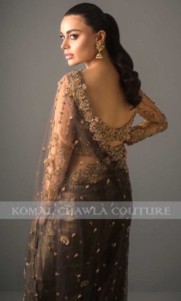 Featuring Ayeza Khan in Komal Chawla’s new collection. A splendor outfit layered over pure masuri silk is knitted with a golden bootie. The pastel shade of mint green on angarkha style tail frock with bustier uplifts its beauty. The outfit is paired with Dhaka style pajamas as the metallic and stony ornaments mingle all over