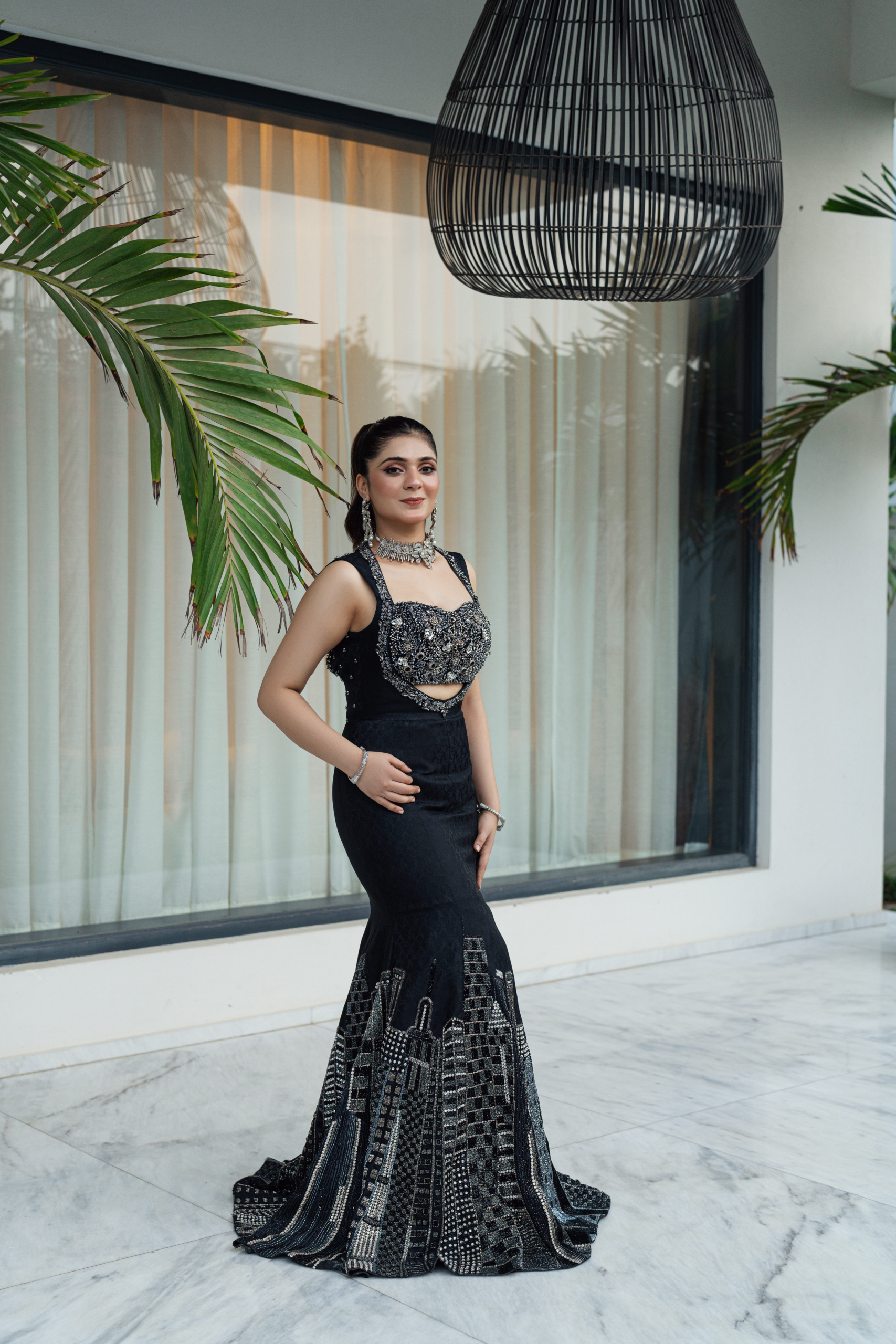 Including:Architectural elegance! Our black halter neck mermaid gown features an attached 3D embellished bodice and intricate hem embroidery inspired by ancient cutdana architecture.